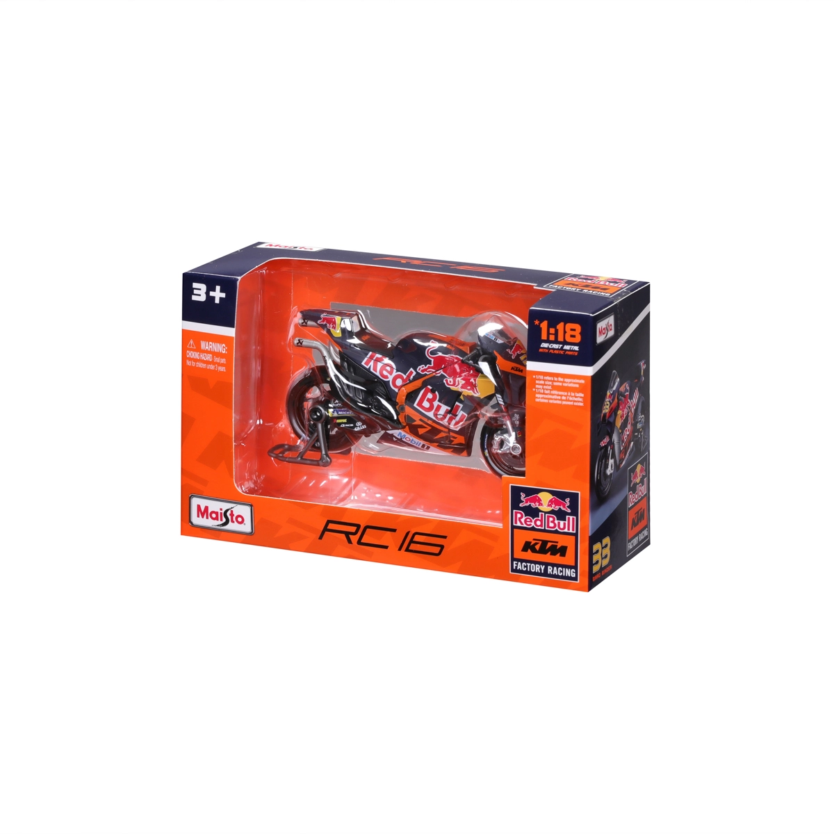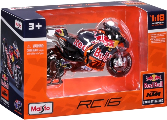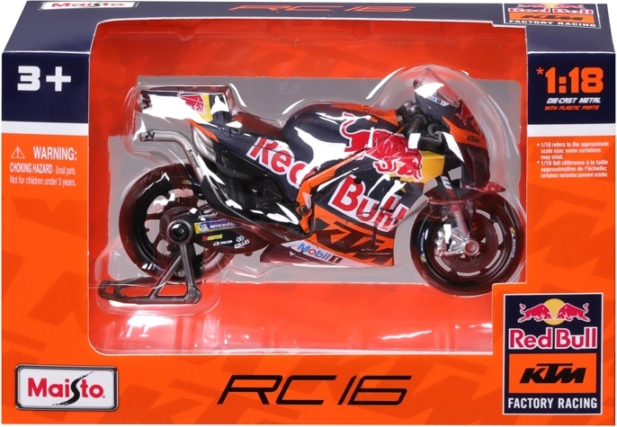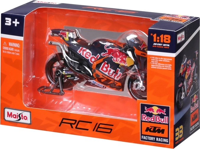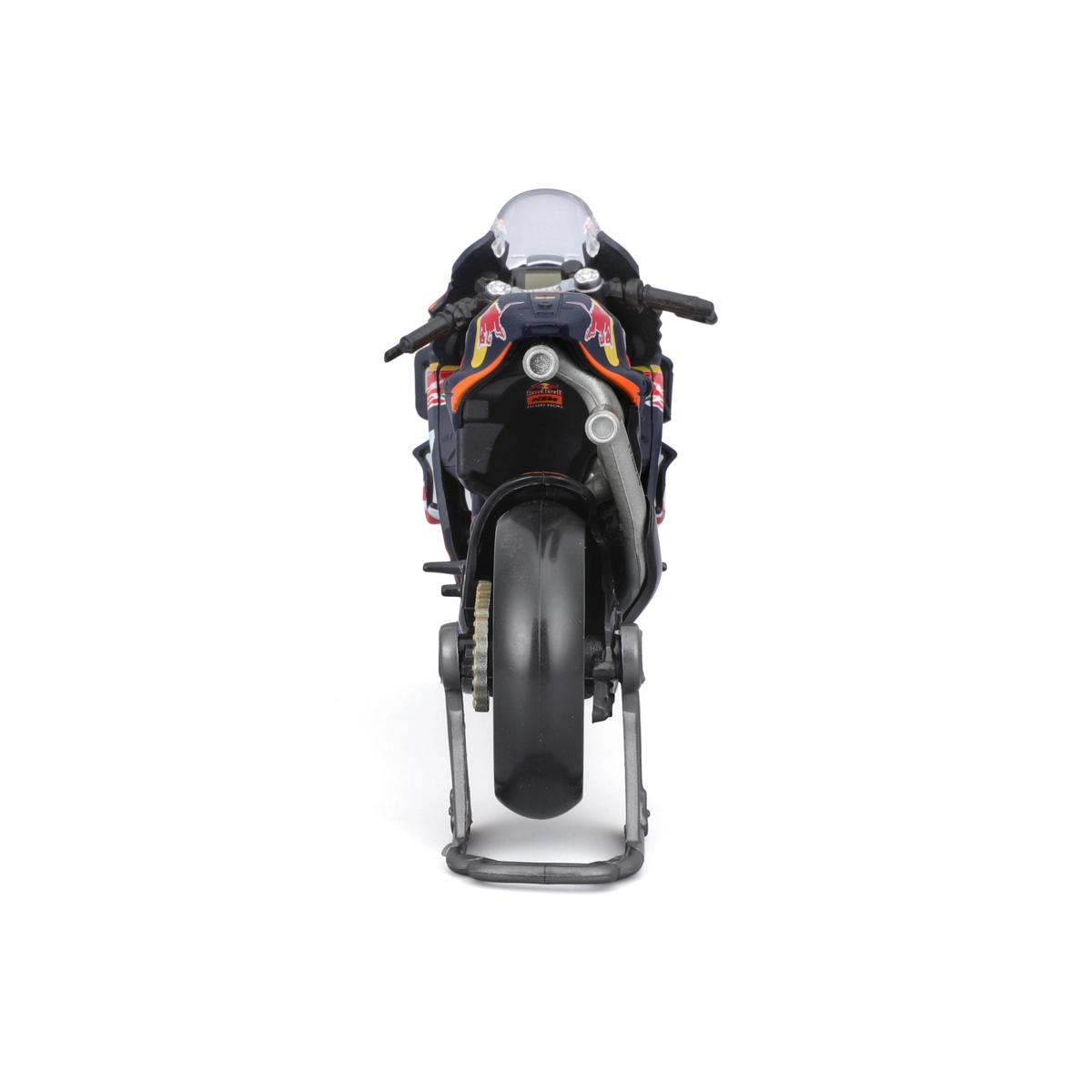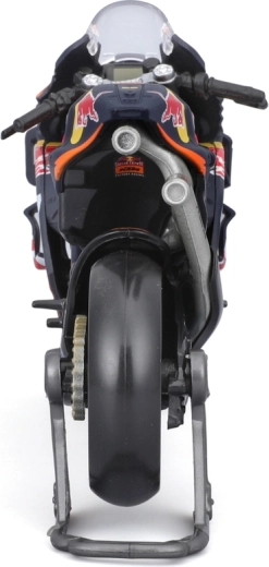 Dank drehbarer Räder und Details wie Bremsscheiben, Auspuff, Lenker sowie einem transparenten Front-Windschild wirkt das Modell maximal realistisch. Ein Paddock-Ständer für einen stabilen Stand ist ebenfalls enthalten. Die offizielle Lizenz garantiert die exakten Farben und Grafiken des Teams RED BULL KTM mit der Startnummer 33.