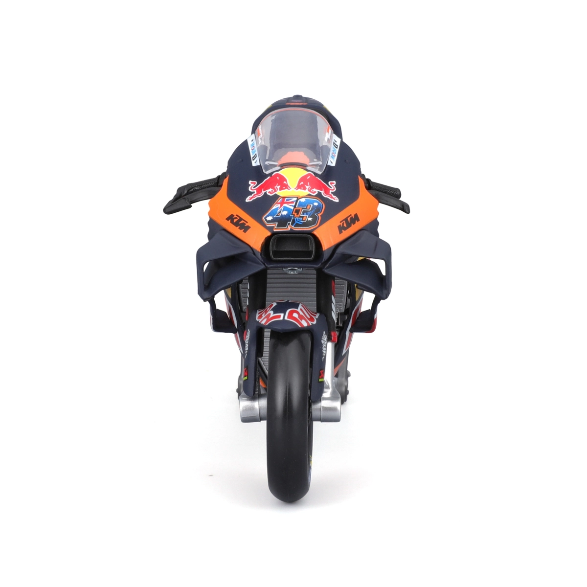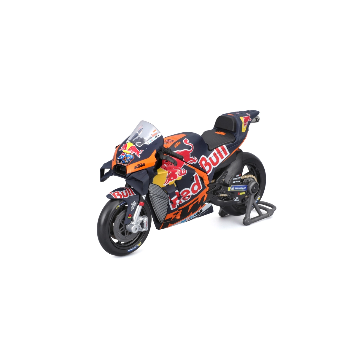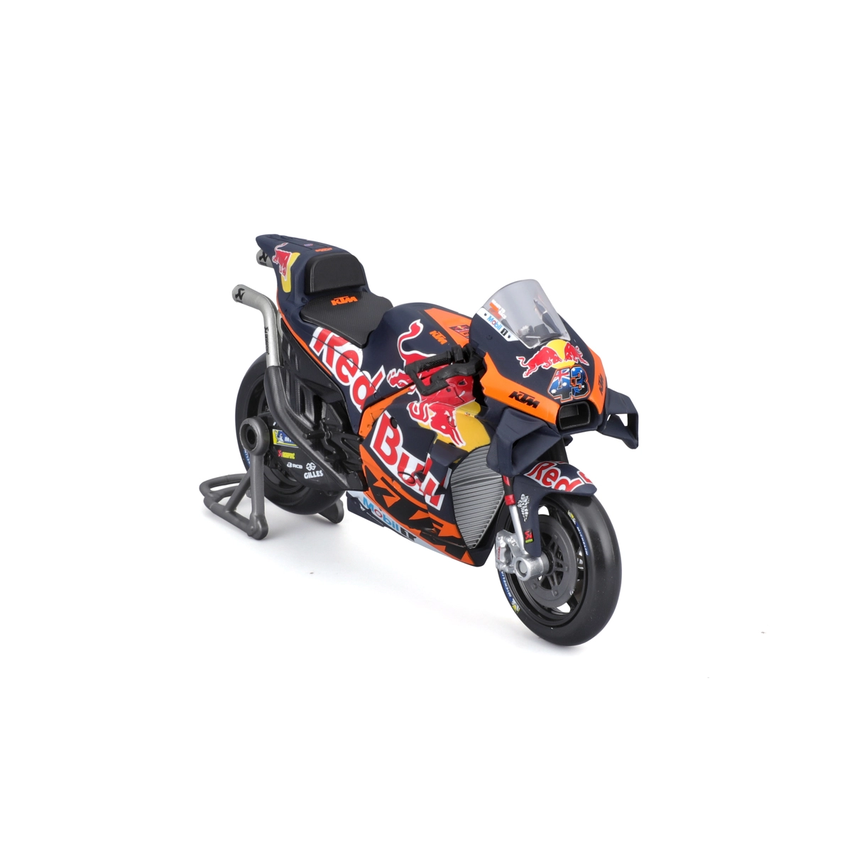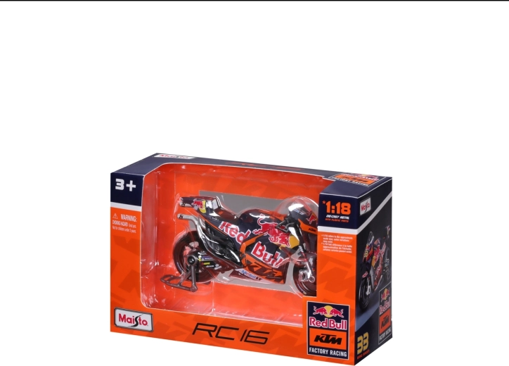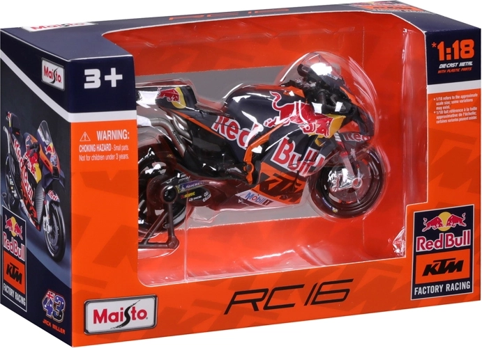 Dieses realistische MAISTO-Modell zeigt das Rennspecial KTM RC16 in den Farben von Red Bull für die Saison 2023 mit der Startnummer 43 – Jack Miller. Dank hochwertiger Metallkarosserie, präzisen Sponsorenaufdrucken und funktionalen Details wirkt es wie eine verkleinerte echte MotoGP-Maschine.