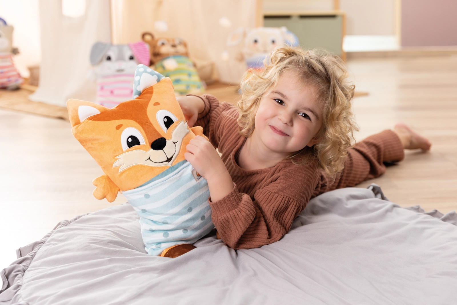 Kuschelweicher Plüsch und eine angenehme Füllung bieten bequemen Halt beim Ausruhen und Schlafen. Ideal zum Einkuscheln beim Einschlafen.