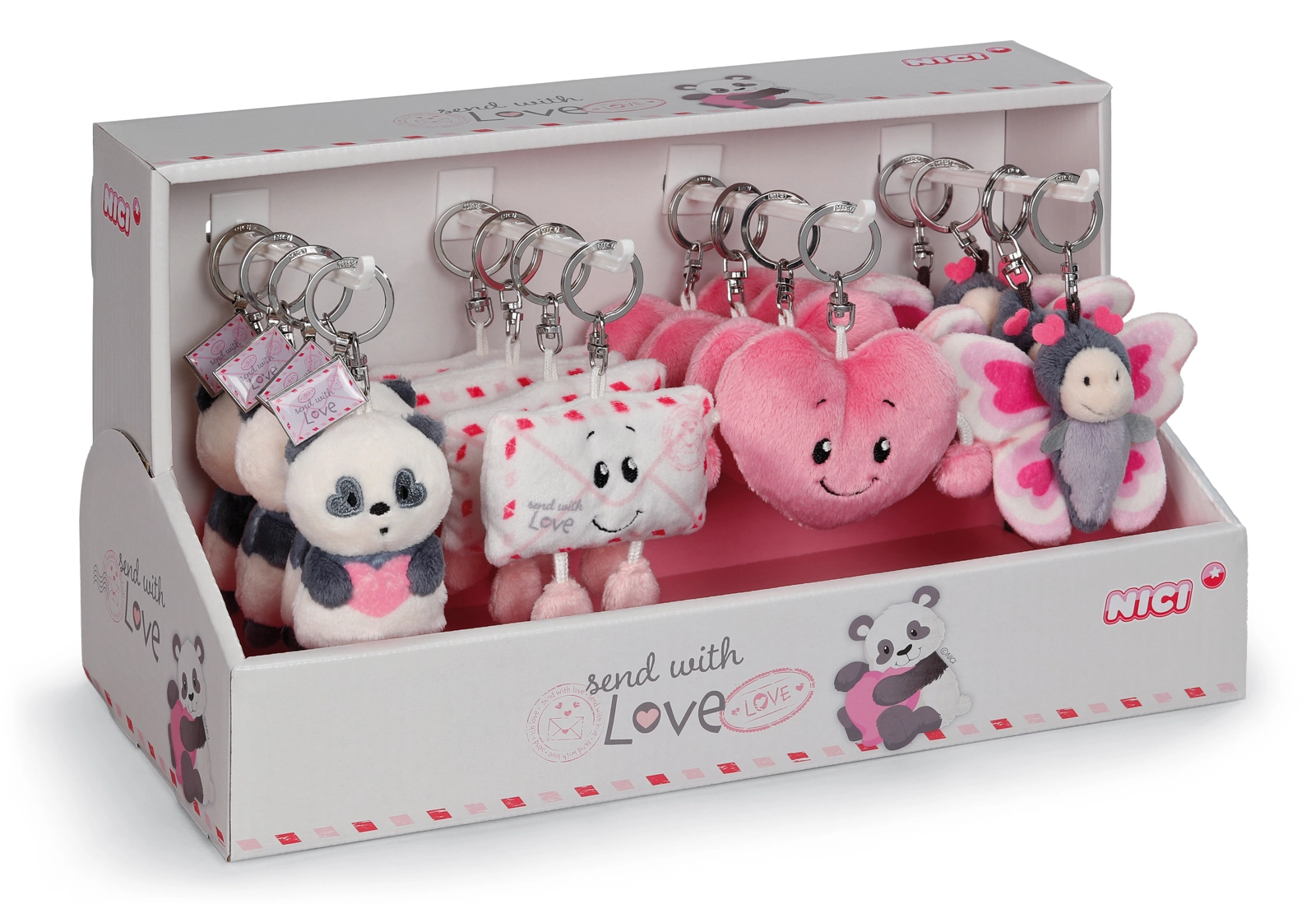 Das vollständig bestückte NICI Love Display bringt bezaubernde Schlüsselanhänger in Form von Panda, Herz, Brief und Schmetterling. Jeder Anhänger ist aus weichem Plüsch gefertigt und mit einem Metallring (einige Varianten auch mit Karabiner) für eine einfache und sichere Befestigung versehen. Dank der kompakten Größe von ca. 6–8 cm eignen sich die Schlüsselanhänger ideal für Schlüssel, Aktentasche oder Handtasche.