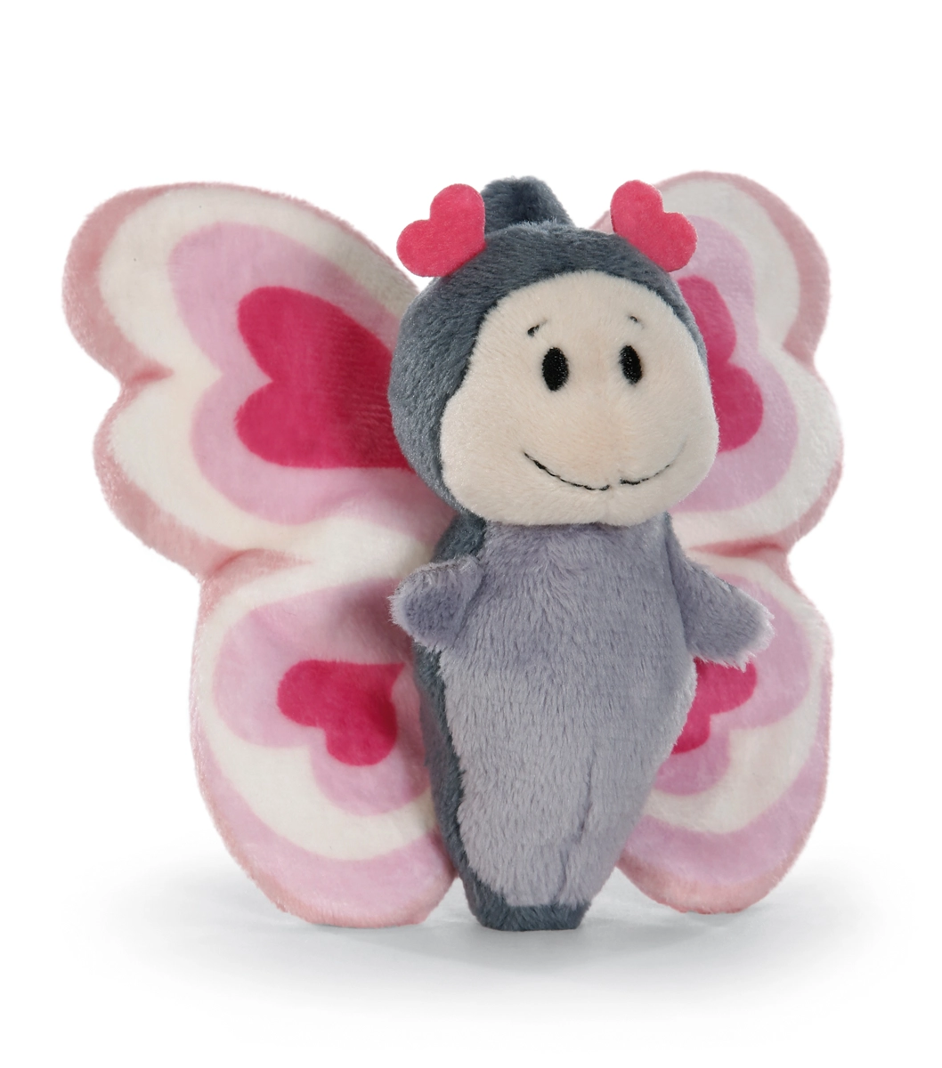 Der sanfte Körper in Grautönen und die rosa Flügel mit Herzchen sorgen dafür, dass man sich auf den ersten Blick und beim ersten Anfassen in den Schmetterling verliebt.
