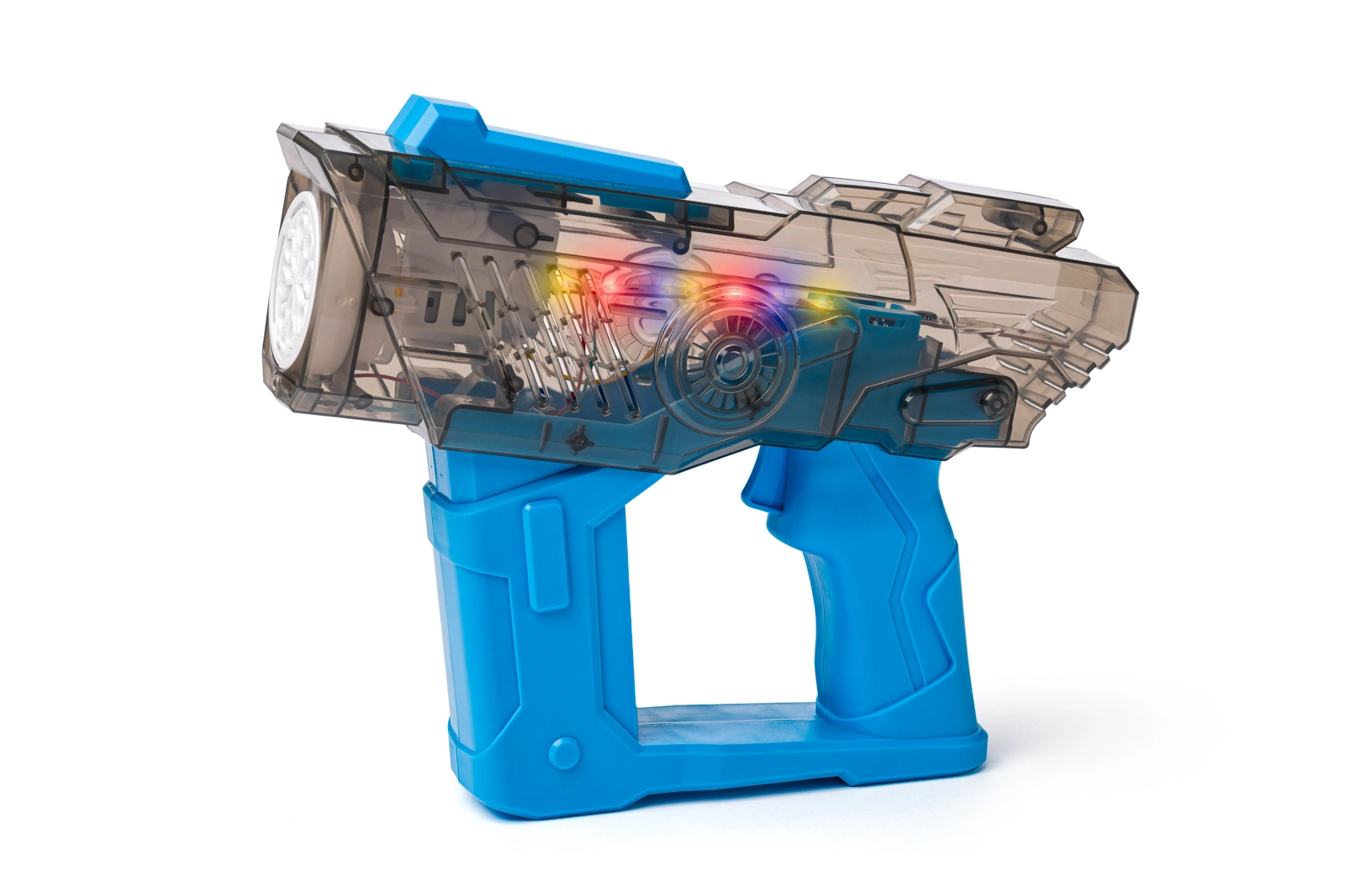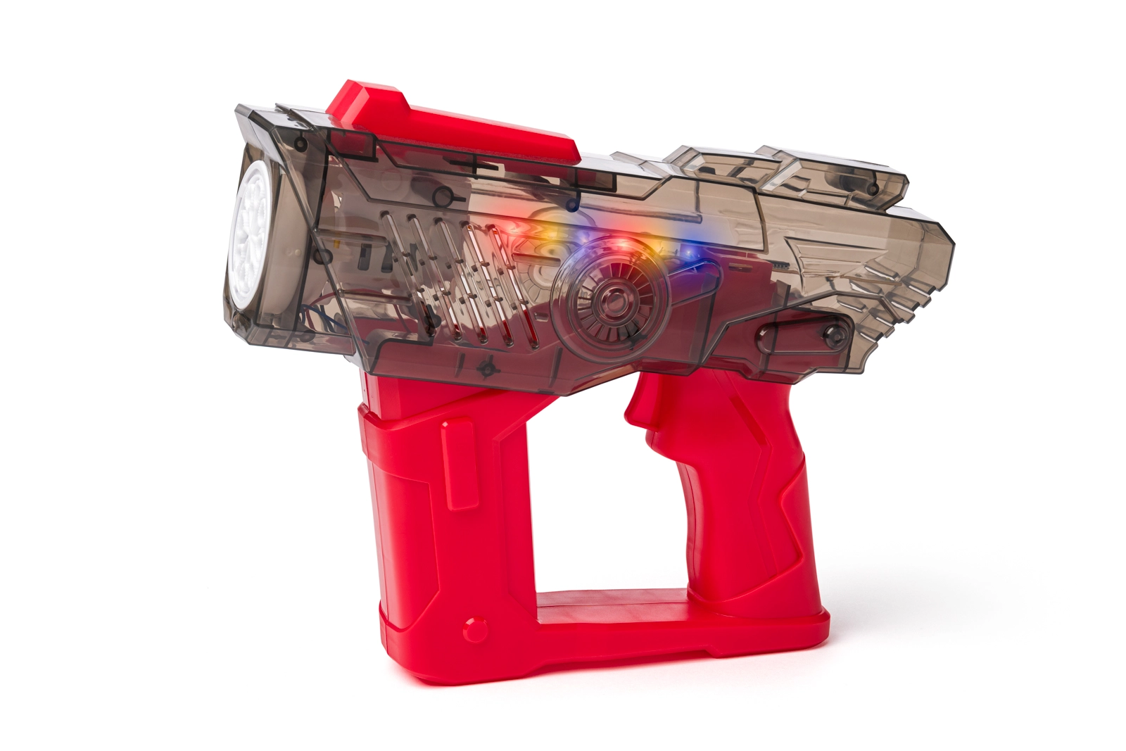 Das transparente Gehäuse mit integrierten LEDs lässt den Blaster in Regenbogenfarben erstrahlen. Die Lichter aktivieren sich beim Start und erzeugen eine fesselnde Lichtshow.