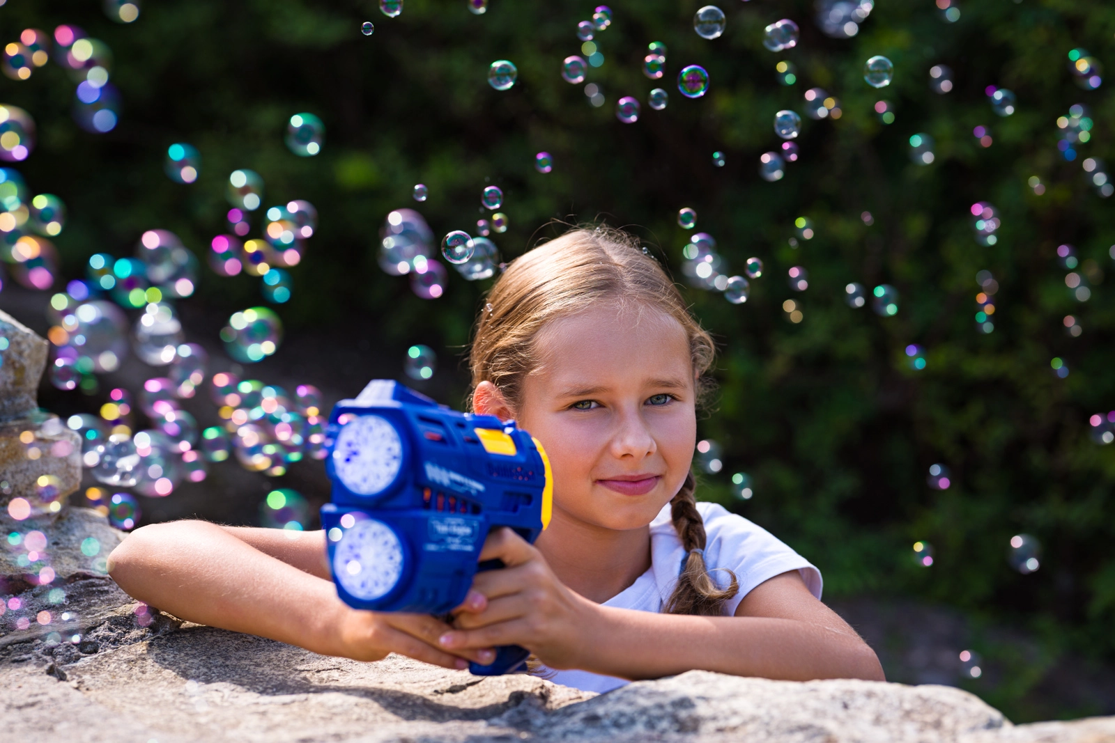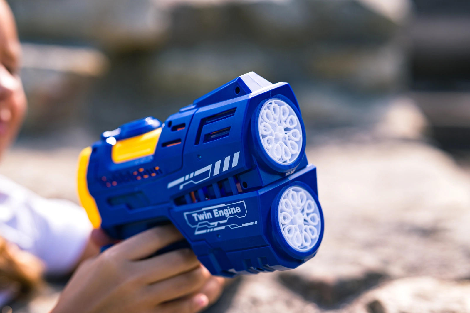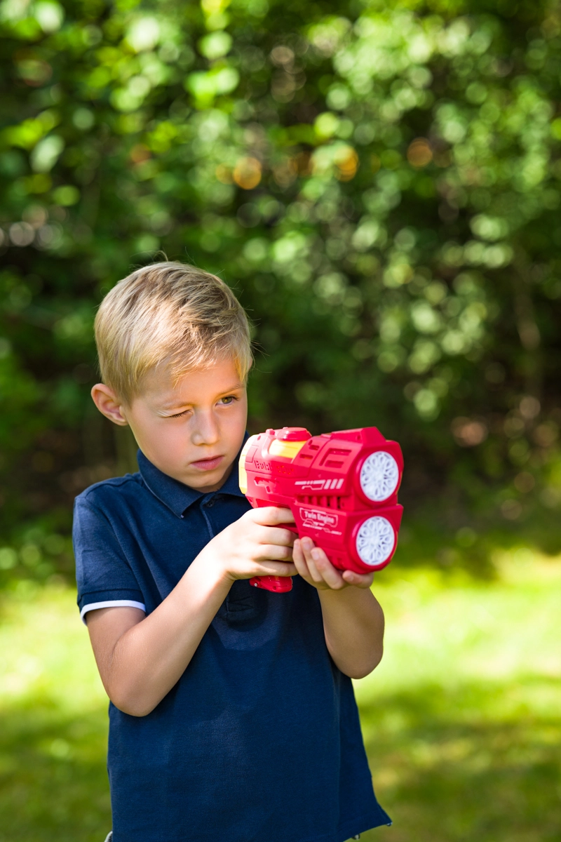 Zwanzig Blasenauslässe erzeugen in Sekunden einen dichten Strom feiner Seifenblasen – perfekt für Partys und den Alltagsspielspaß.