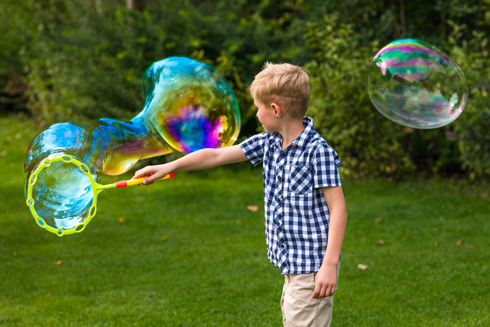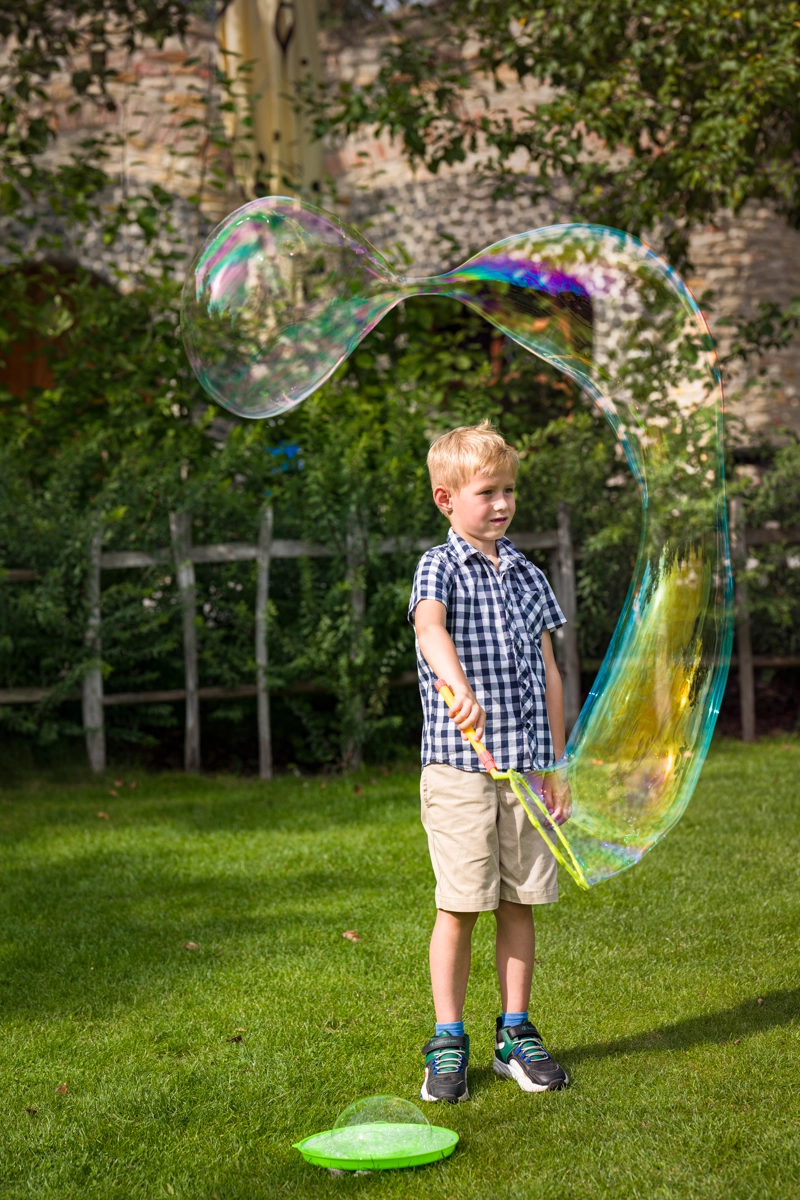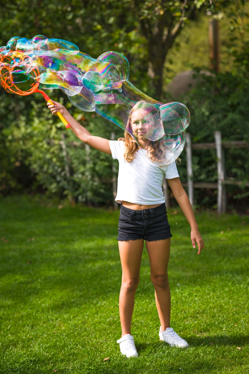 Wechsle den Aufsatz für riesige Seifenblasen oder für eine Flut kleinerer Bläschen – das Ergebnis ist immer beeindruckend.
