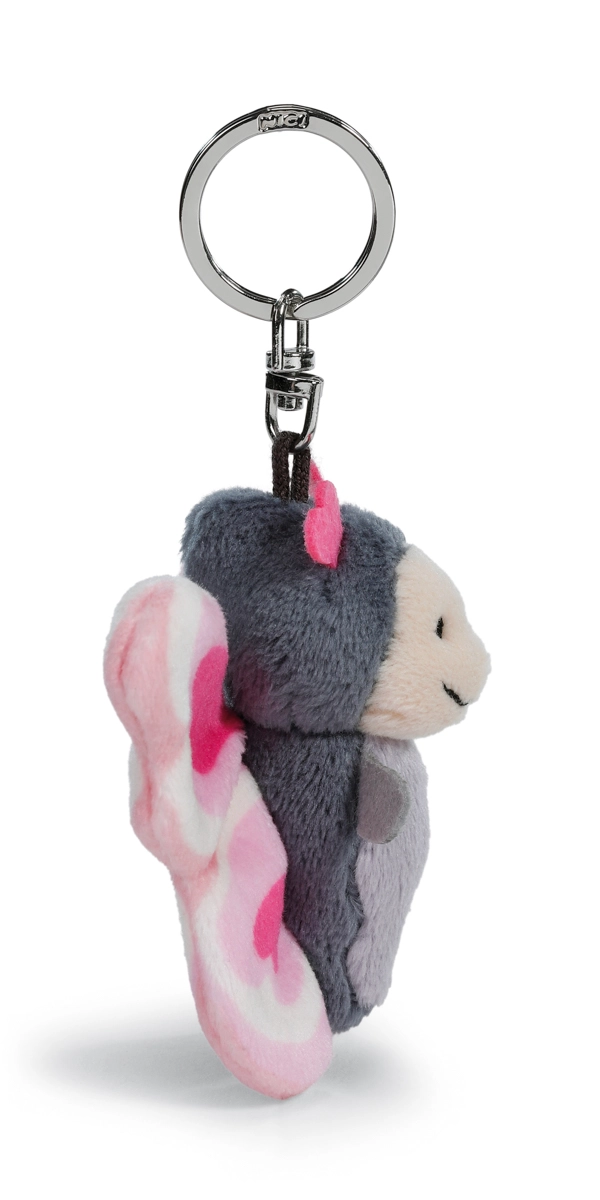 Der weiche graue Körper, rosa Flügel und herzförmige Details fallen sofort ins Auge und verleihen Schlüsseln oder Rucksack eine persönliche Note.