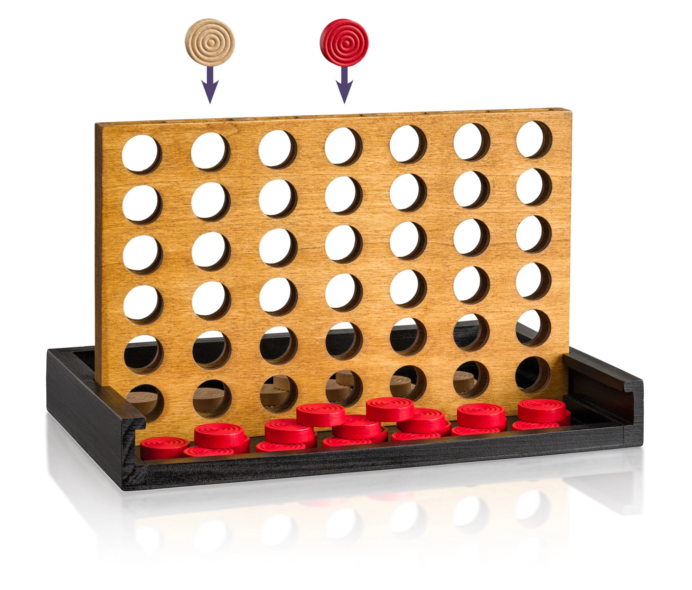 Das Holzspiel 4 in einer Reihe ist ein zeitloser Familienklassiker für 2 Spieler. Lassen Sie abwechselnd rote und weiße Spielsteine in die Spalten fallen und versuchen Sie als Erste/r, vier in einer Reihe zu bilden – waagerecht, senkrecht oder diagonal. Das hochwertige Holzbrett mit stabilem Sockel gewährleistet flüssiges Spiel ohne Wackeln und eine einfache Handhabung der Steine.