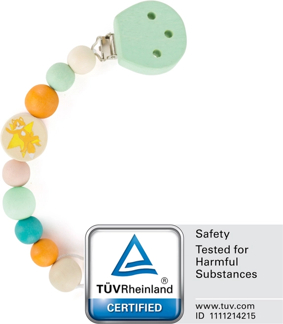 Praktischer und stilvoller Schnullerclip aus Naturholz hält den Schnuller stets griffbereit und sauber. Er ist speichelfest, aus sicheren, ungiftigen Materialien gefertigt und die bunten Perlen und Formen unterstützen die Entwicklung der Feinmotorik von Geburt an.
