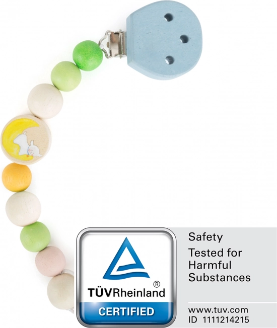 Ein praktischer und sicherer Schnullerclip aus hochwertigem Holz hält den Schnuller stets griffbereit. Er ist speichelfest, besitzt fein geschliffene Holzkugeln für sensorisches Entdecken und fördert die Feinmotorik sowie die Neugier der Kleinsten.