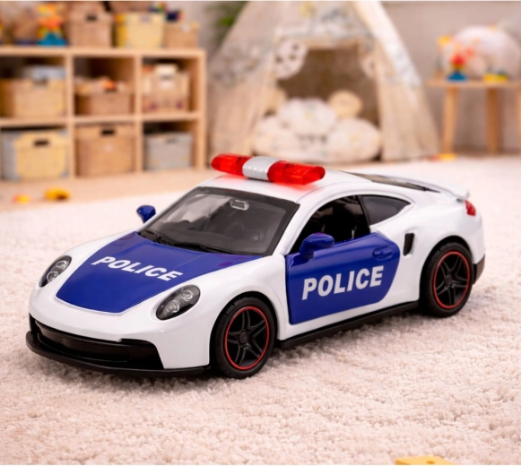 Das polizeiliche Sportmodell kombiniert modernes Aussehen mit Funktionen, die Kinder lieben. Der Pull-Back-Mechanismus sorgt mit einem Zug nach hinten für einen schnellen Start, während die öffnenden Türen jede Verfolgung realistischer machen. Dank der Metallkarosserie und der sorgfältigen Verarbeitung ist das Auto robust und bereit für den täglichen Einsatz.
