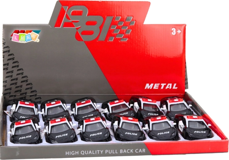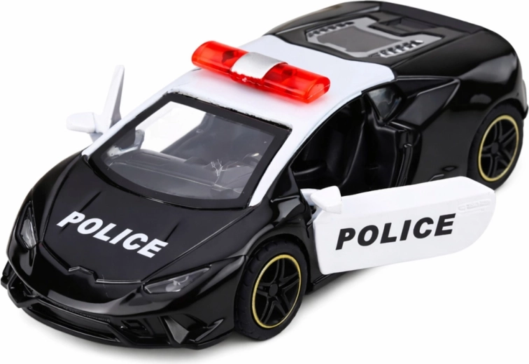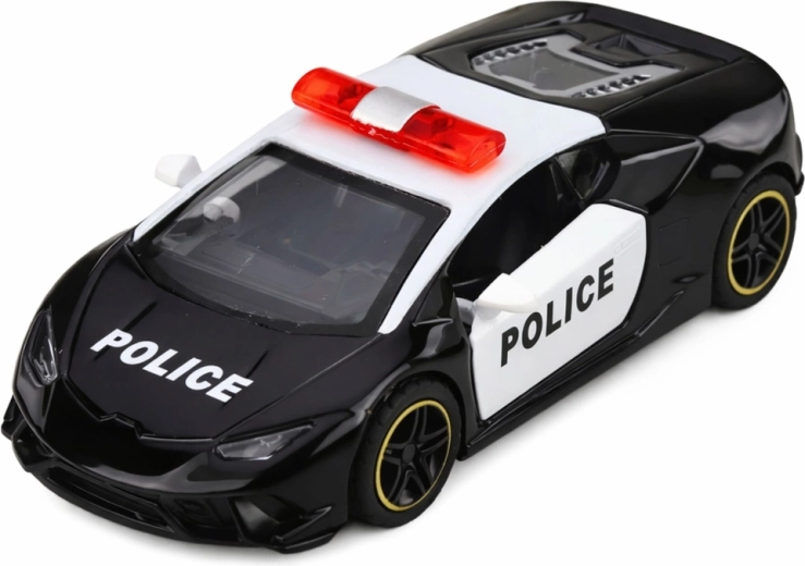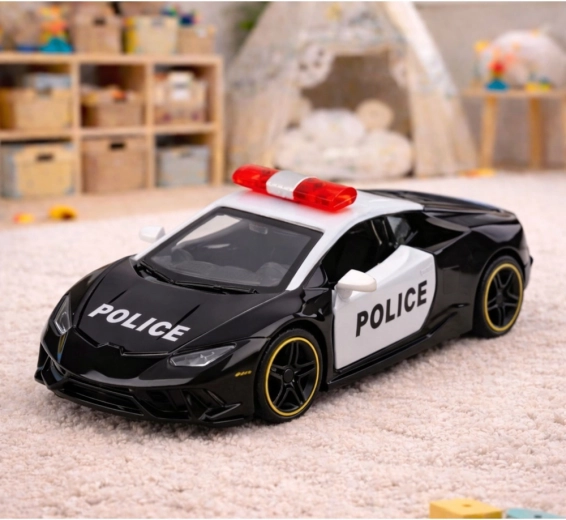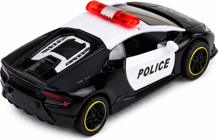 Die Metallkarosserie im schwarz-weißen Polizeidesign mit markantem Lichtbalken auf dem Dach und detailreichen Rädern wirkt sowohl in Fahrt als auch im Regal beeindruckend. Ideal für das Spielen zu Hause und als Sammlermodell.