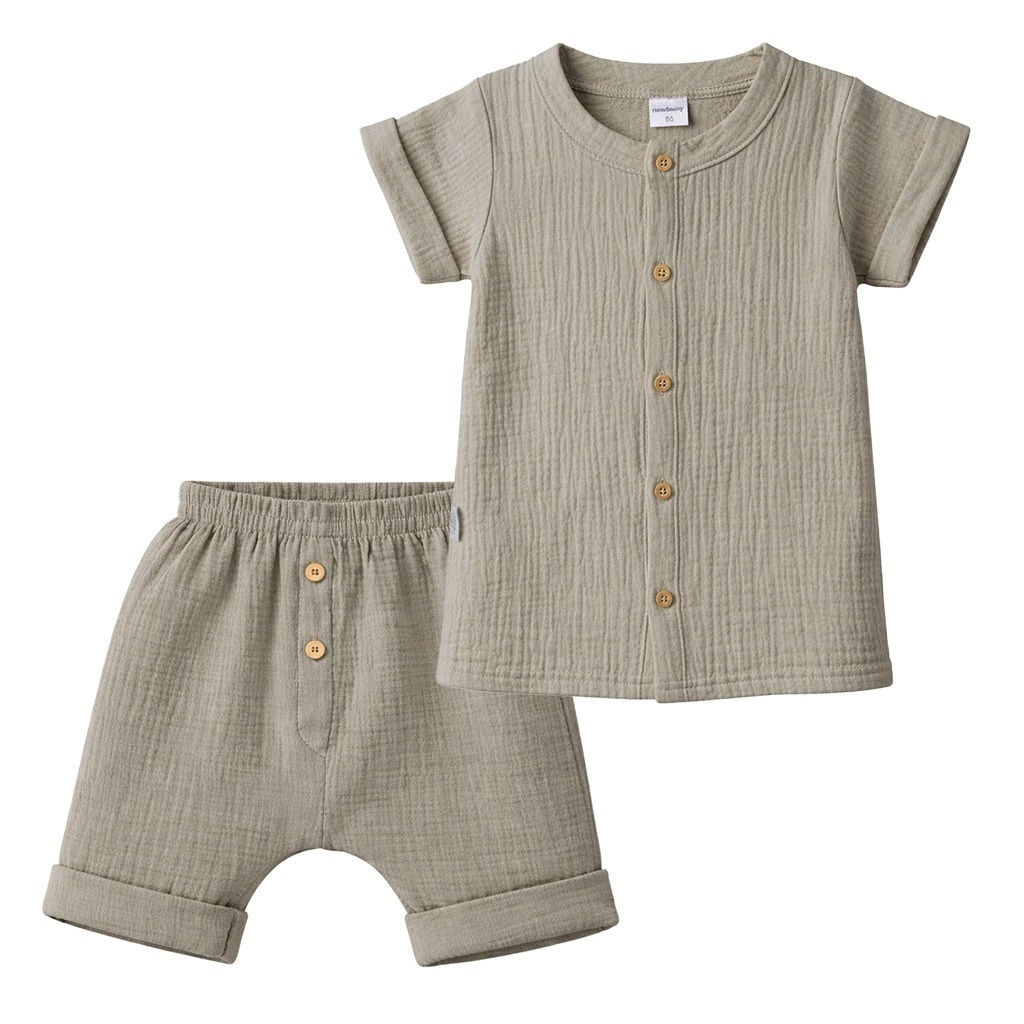 Dieses stylische Musselin-Set ist ideal für den Alltag im Sommer. Der natürlich luftige Stoff sorgt für Luftzirkulation, sodass sich Ihr Kind auch bei Hitze wohlfühlt. Das Hemd mit Knopfleiste erleichtert das Anziehen und die Shorts mit elastischem Bund sitzen hervorragend, ohne einzuengen.