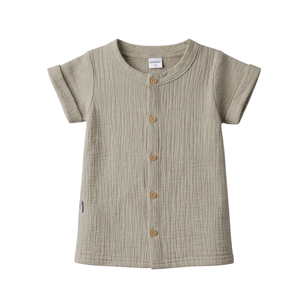 Knöpfe in Holzoptik, umgeschlagene Säume und ein strapazierfähiger Stoff, der häufiges Waschen meistert und mit der Zeit noch weicher wird.