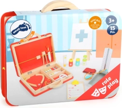 Dieses hochwertige hölzerne Rettungsset im Koffer ist ideal für Arztspiele. Dank der umfangreichen Ausstattung und funktionalen Elemente, wie Pumpfunktionen an Spritzen und Spendern, können Kinder realistisch Puppen und Plüschtiere „behandeln“, den Blutdruck messen und alles in der eigenen medizinischen Dokumentation notieren.