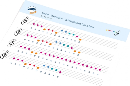 Die beiliegenden farbcodierten Notenblätter (z. B. „Old MacDonald“) helfen Kindern, Farben den Tönen zuzuordnen und schnell die ersten Melodien zu erlernen.