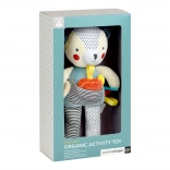Die nachhaltige Herstellung wird durch den Einsatz von GOTS-Bio-Baumwolle, recycelten Materialien und ungiftigen Farben unterstützt. Das Spielzeug ist leicht, gut greifbar und sicher für Babys 0+ – ideal für Kinderwagen, Bettchen und zu Hause.