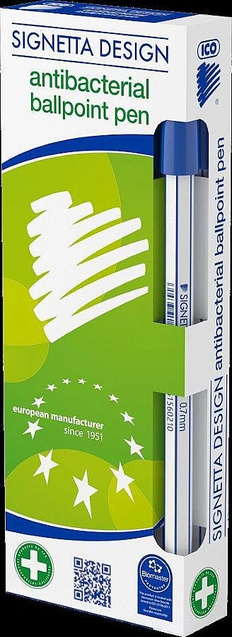 Der antibakterielle Kugelschreiber ICO Signetta ist die ideale Wahl fürs Büro, die Schule und den Empfangsbereich, wo er von mehreren Nutzern verwendet wird. Eine spezielle Mischung mit Silber-Nanopartikeln ist direkt im Material des Stiftschafts integriert und hemmt die Vermehrung von Bakterien auf seiner Oberfläche, wodurch ein höheres Maß an Hygiene bei der täglichen Nutzung unterstützt wird.