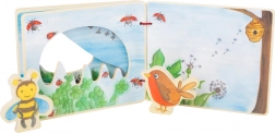 Zwei Holzfiguren begleiten das Kind beim Lesen und Spielen und können mithilfe von Klettverschlüssen auf der Rückseite des Buches befestigt werden.