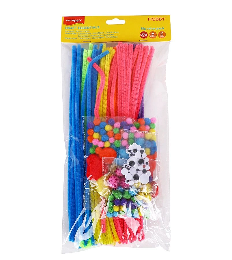 Praktisches Set mit Pompons, flauschigen Pfeifenreinigern und selbstklebenden Wackelaugen in vielen Farben und Größen. Der ideale Start für Dutzende kreativer Ideen.