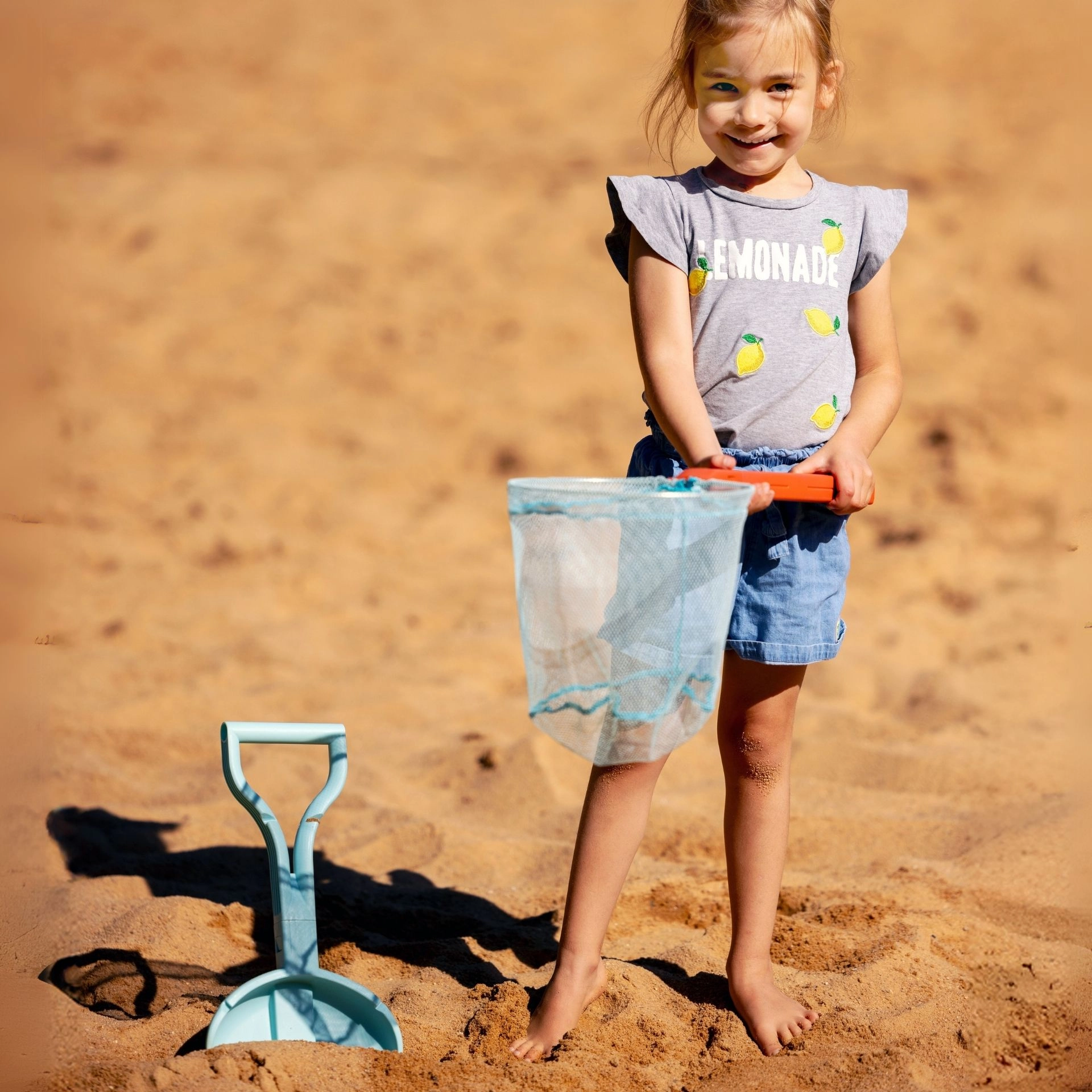 Dieses praktische 2-in-1 Strand-Set ist ein großartiger Helfer für Kinderspiele am Strand, am Teich und im Pool. Es kombiniert die Funktion einer Schaufel zum Graben und Formen von Sand mit einem Netz zum Fangen von Muscheln und kleinen Schätzen. Dank der teleskopischen Verlängerung von 40 cm auf 70 cm passt es sich leicht der Größe des Kindes an und bietet eine bessere Reichweite.