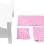 Zum Bettchen gehören ein weiches Kissen, eine Decke und ein Laken mit rosafarbenem Muster für maximalen Puppenkomfort.
