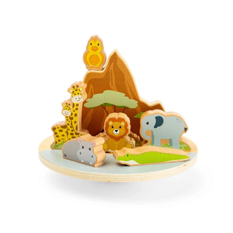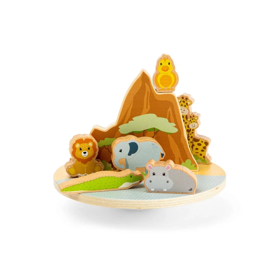 Das Dschungel-Balancespiel verbindet Spielspaß und Lernen. Auf der sanft schaukelnden Basis finden Kinder das Gleichgewicht für Löwe, Elefant, Giraffen, Nilpferd, Krokodil und Vogel. Die farbigen, massiven Figuren liegen gut in kleinen Händen und unterstützen kreatives Geschichtenerzählen sowie logisches Denken.