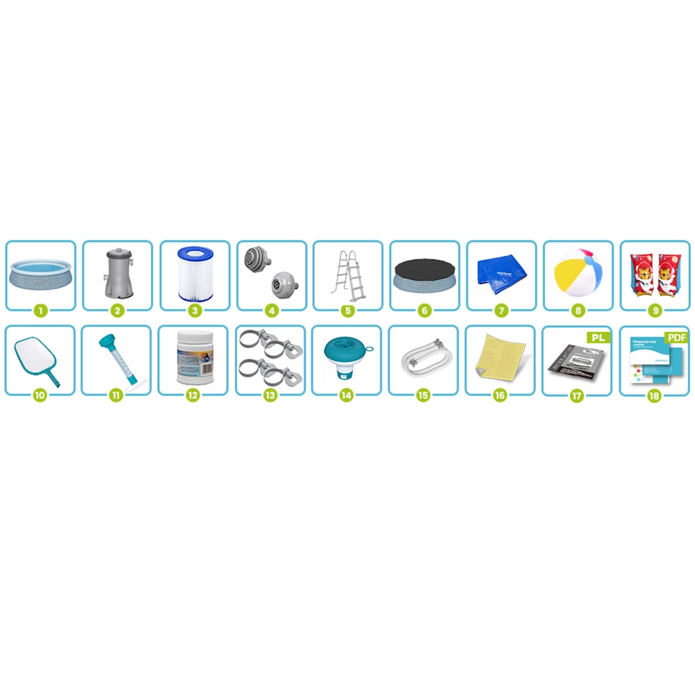 Enthalten ist ein komplettes 18in1-Set für die sofortige Nutzung: eine leistungsstarke Filterpumpe 2006 l/h mit Filter Typ II, eine Sicherheitsleiter mit abnehmbaren Stufen, eine Abdeckplane und eine Unterlage für längere Lebensdauer, außerdem ein Kescher, Thermometer, Chemiedosierer und Multitabletten für kristallklares Wasser. Ebenfalls dabei: Strandball, aufblasbare Schwimmflügel, Reparaturflicken und Anleitung in Tschechisch.