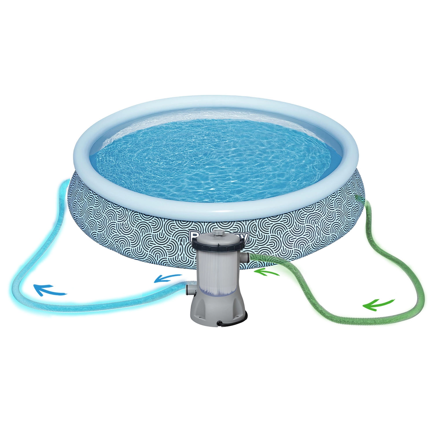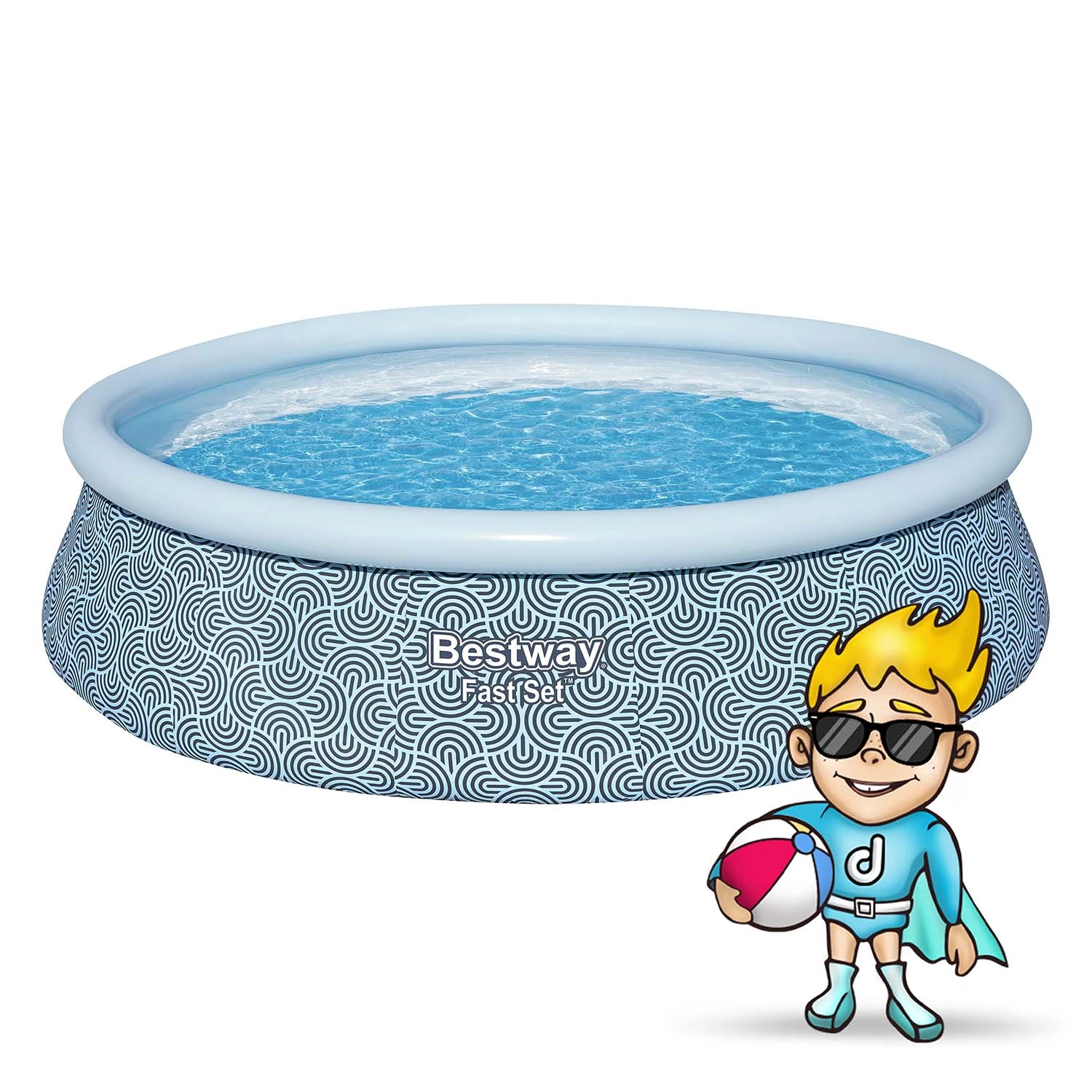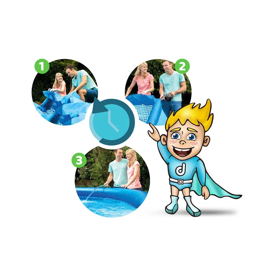 Die selbsttragende Konstruktion mit aufblasbarem oberem Ring ermöglicht den Aufbau in wenigen Schritten: ausbreiten, aufpumpen, befüllen. Die ideale Lösung für einen raschen Start in die Saison.