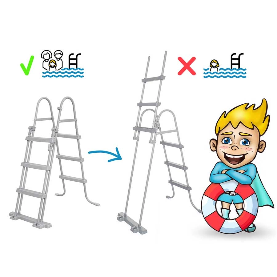 Die robuste Leiter mit abnehmbaren Stufen erhöht die Sicherheit, die Abdeckplane schützt vor Schmutz und die Unterlage schont den Boden. Alles in einem praktischen 18in1-Set.