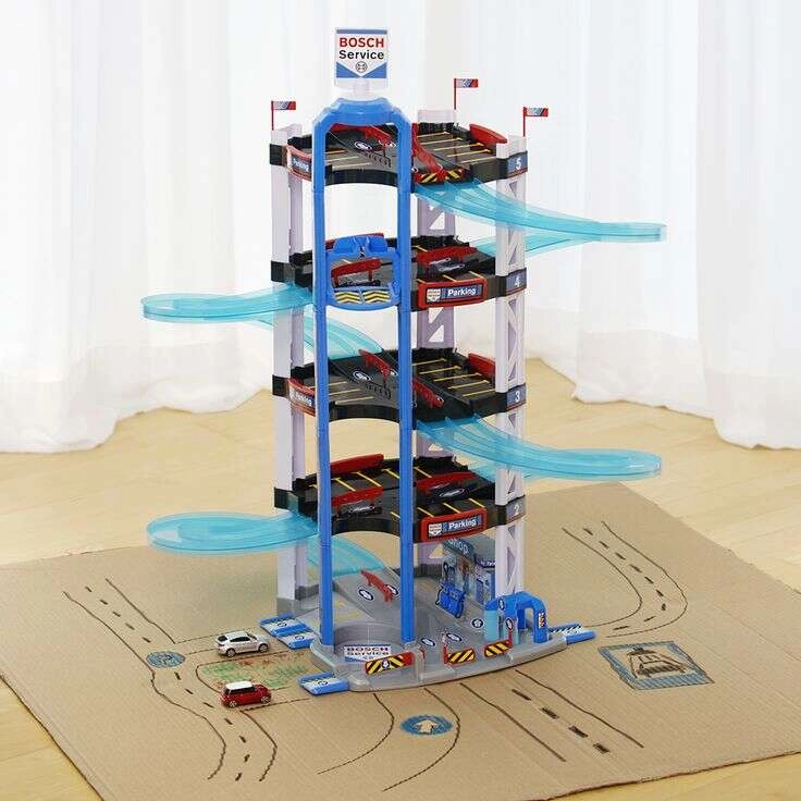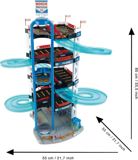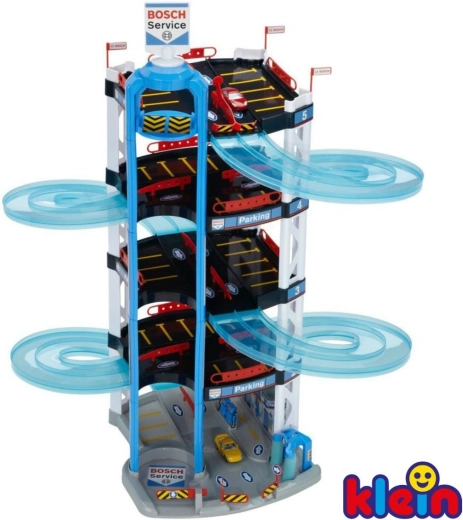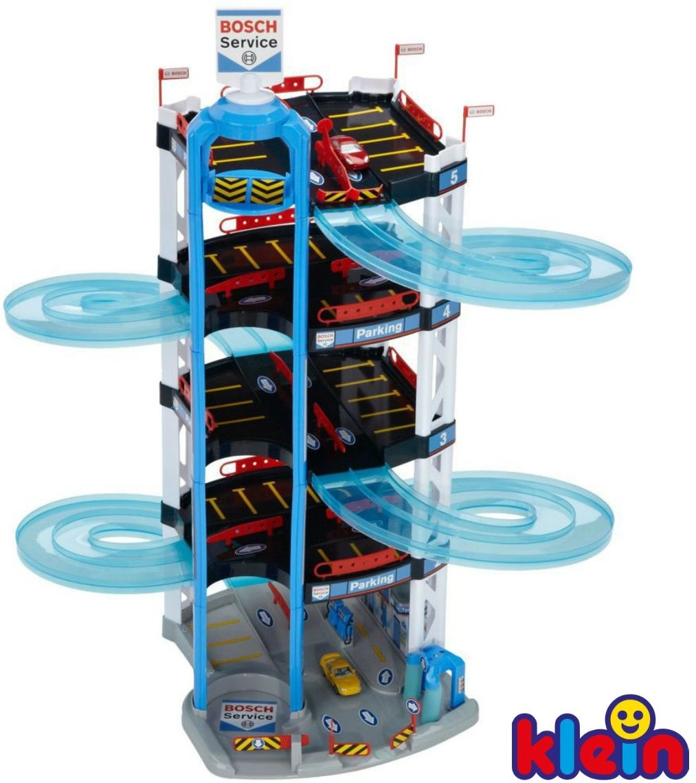 Dieser robuste fünfstöckige Parkgaragen-Komplex BOSCH Service der Marke Klein ist für kleine Rennfahrer gemacht. Er bietet halbtransparente doppelte Spiralrampen vom obersten Stockwerk bis nach unten, einen manuell bedienbaren Aufzug zum Transport der Autos zwischen den Etagen sowie Start/Ziel für Rennen mit zwei Autos. Auf den einzelnen Ebenen gibt es viele Parkplätze und im Erdgeschoss zusätzlich eine Servicezone mit „Station“ für besonders realistisches Spiel.