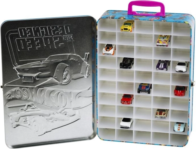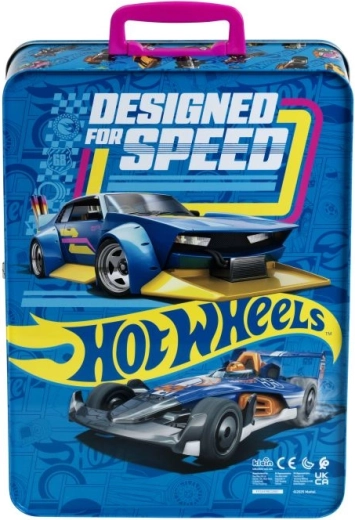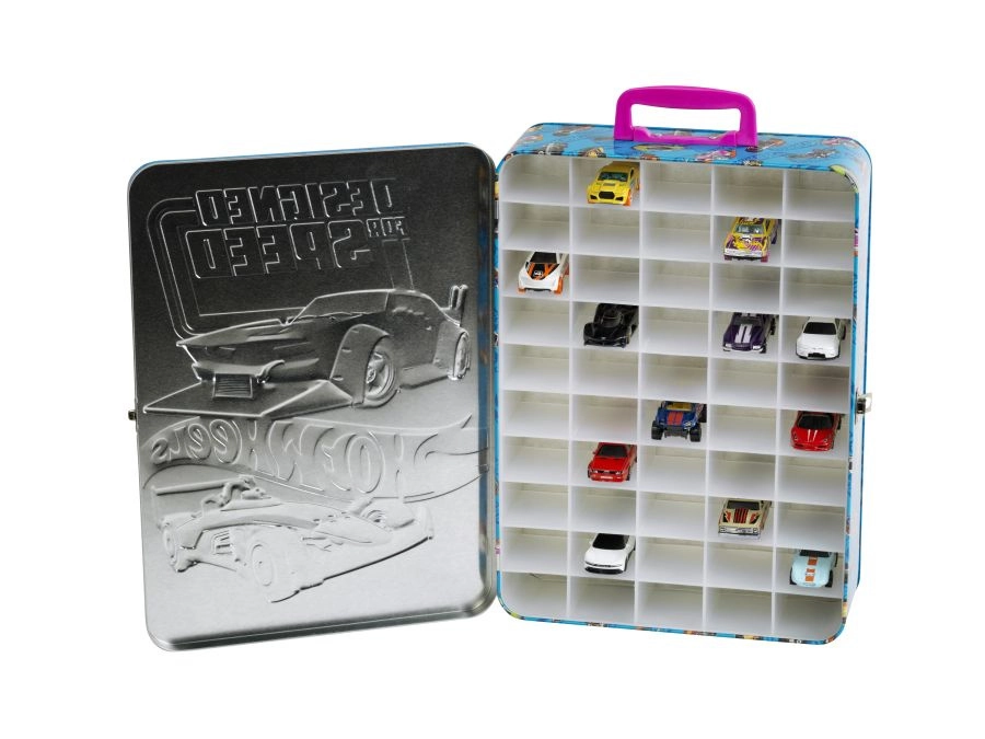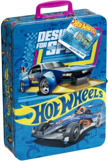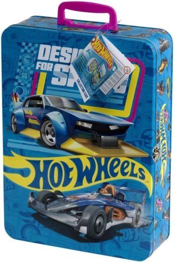 Ein robustes Metallgehäuse mit farbigem Aufdruck und HOT WHEELS-Logo, ein bequemer orangefarbener Griff und ein zuverlässiger Metallclip gegen unbeabsichtigtes Öffnen machen diesen Koffer zur idealen Aufbewahrungslösung für zu Hause und unterwegs.