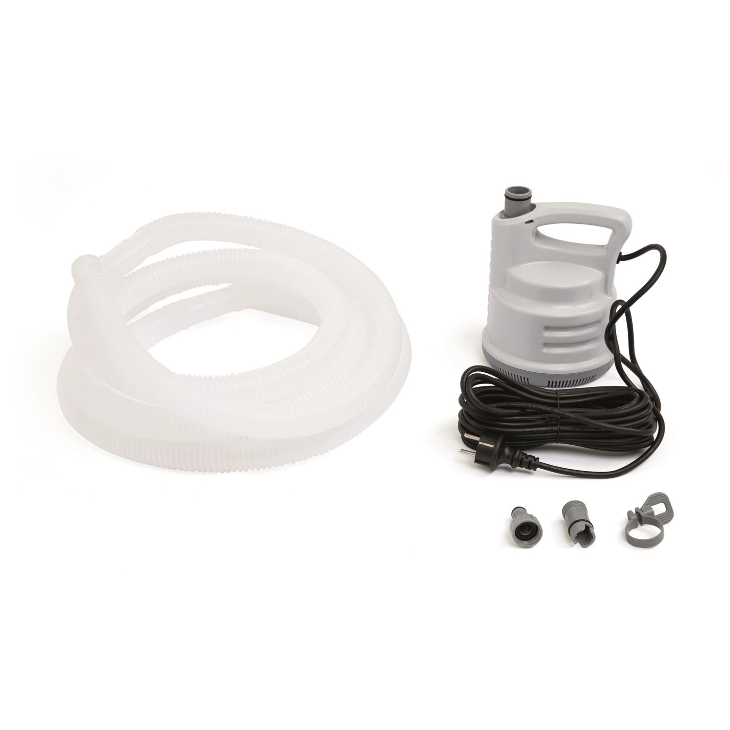 Im Lieferumfang ist alles für den sofortigen Einsatz enthalten – ein 5-m-Ablaufschlauch, Adapter für Gartenschläuche und eine Klammer für einen sicheren Anschluss. Dank der Versorgung mit 220–240 V und einer Leistungsaufnahme von 80 W ist die Pumpe energieeffizient und gleichzeitig leistungsstark genug für ein schnelles Entleeren des Poolwassers.