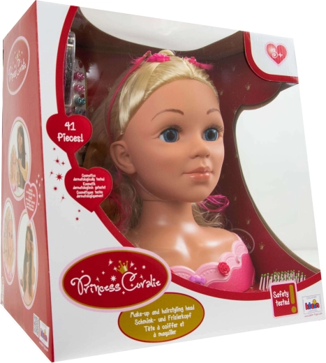 Der PRINCESS CORALIE Frisierkopf begeistert alle kleinen Stylistinnen. Realistisches, langes und leicht kämmbares Haar, blaue Augen und ein stabiler rosafarbener Standfuß sorgen für bequemes und unterhaltsames Gestalten von Frisuren und Make-up. Die umfangreiche Ausstattung mit Bürste, Kamm, Spangen, Perlen und einer Make-up-Palette für Kinder eröffnet Raum für Fantasie.