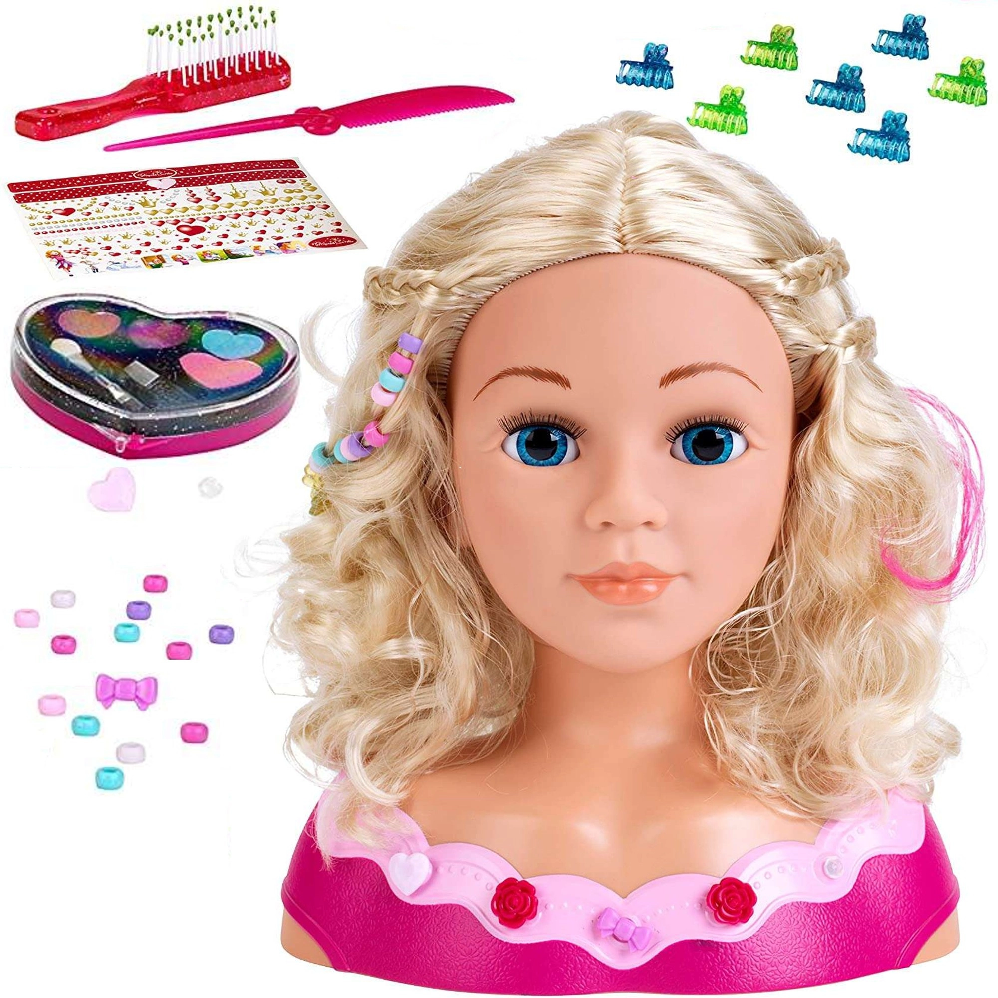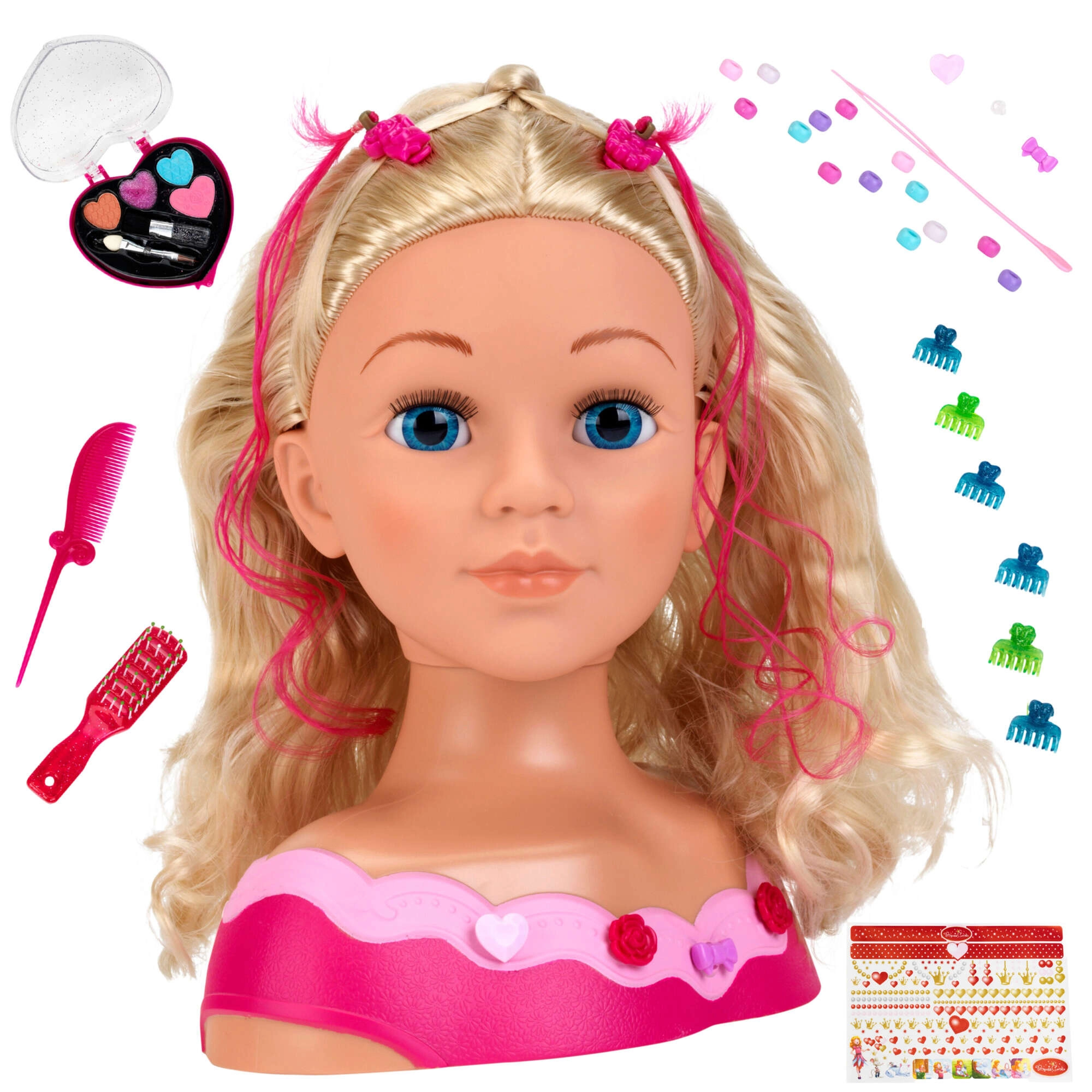 Bürste, Kamm, Clips, Perlen, Ziersträhnen und weiteres Zubehör. Komplette Ausstattung für stundenlangen kreativen Spaß und zum Erlernen neuer Frisiertechniken.