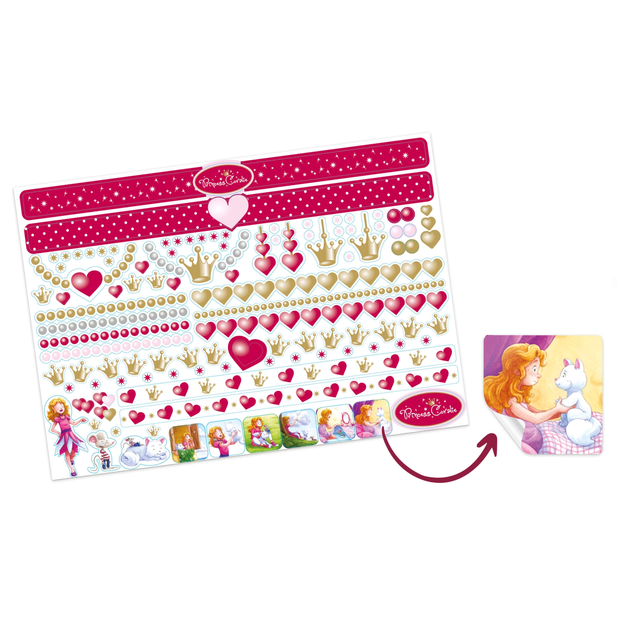 Enthalten ist eine kompakte Palette mit Lidschatten, Lipgloss und Applikatoren für spielerisches PRINCESS CORALIE Schminken. Alles ist für das kindliche Spiel konzipiert.