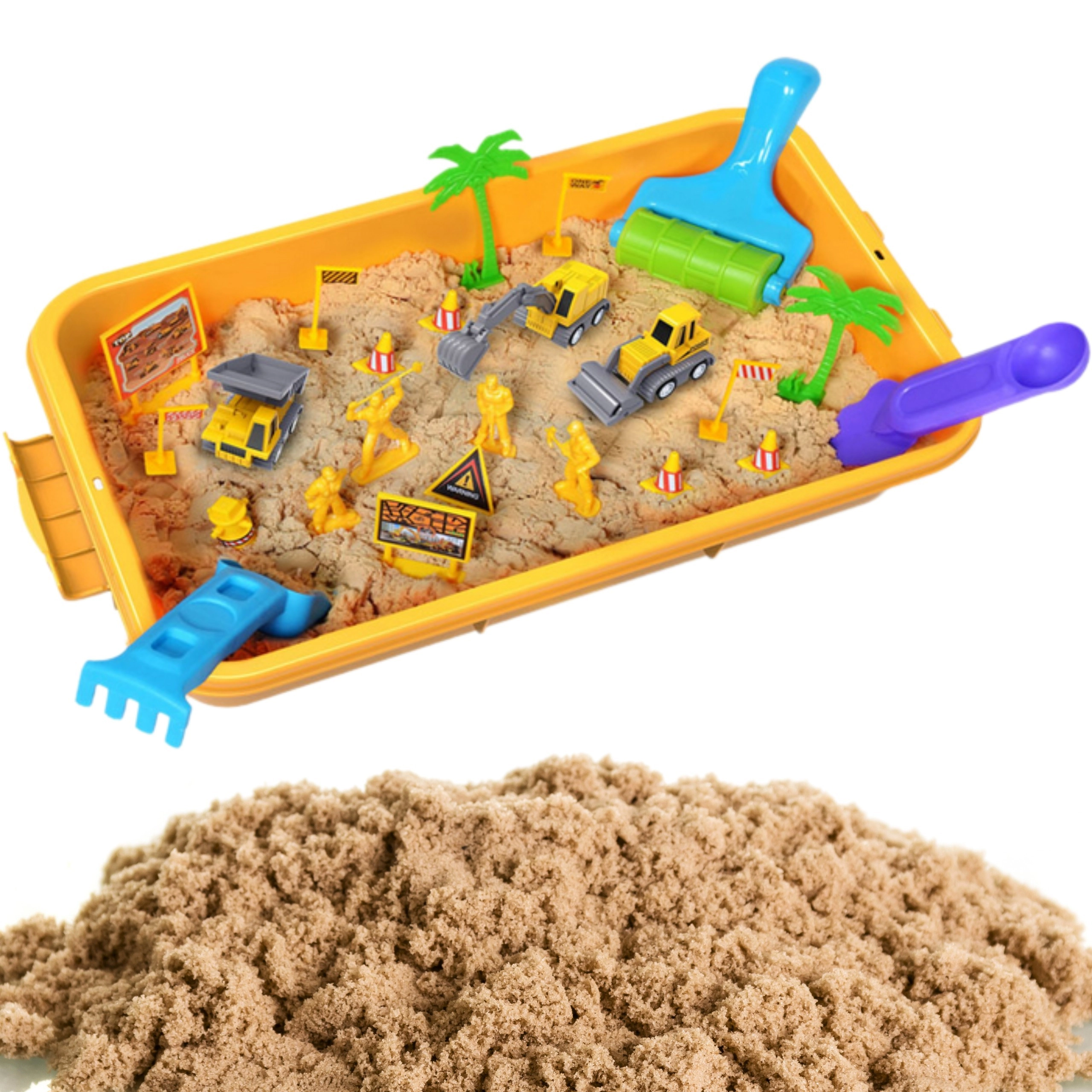 Die Baustelle im Koffer von Woopie verwandelt jeden Tisch in eine Kreativzone. Kinder können die Arbeiten mit Minibaggern, einem Radlader und einem Kipper steuern, Straßen und Hindernisse bauen, Sicherheitszonen abstecken und Arbeiterfiguren einbeziehen. Kinetischer Sand lässt sich angenehm formen, klebt nicht an den Händen und ist dank seiner Eigenschaften leicht wieder in den Koffer zurückzuräumen.