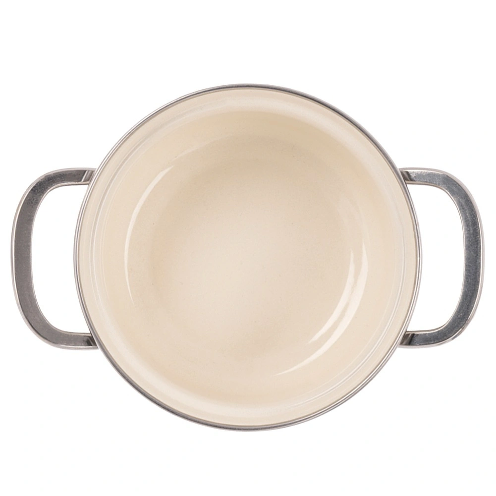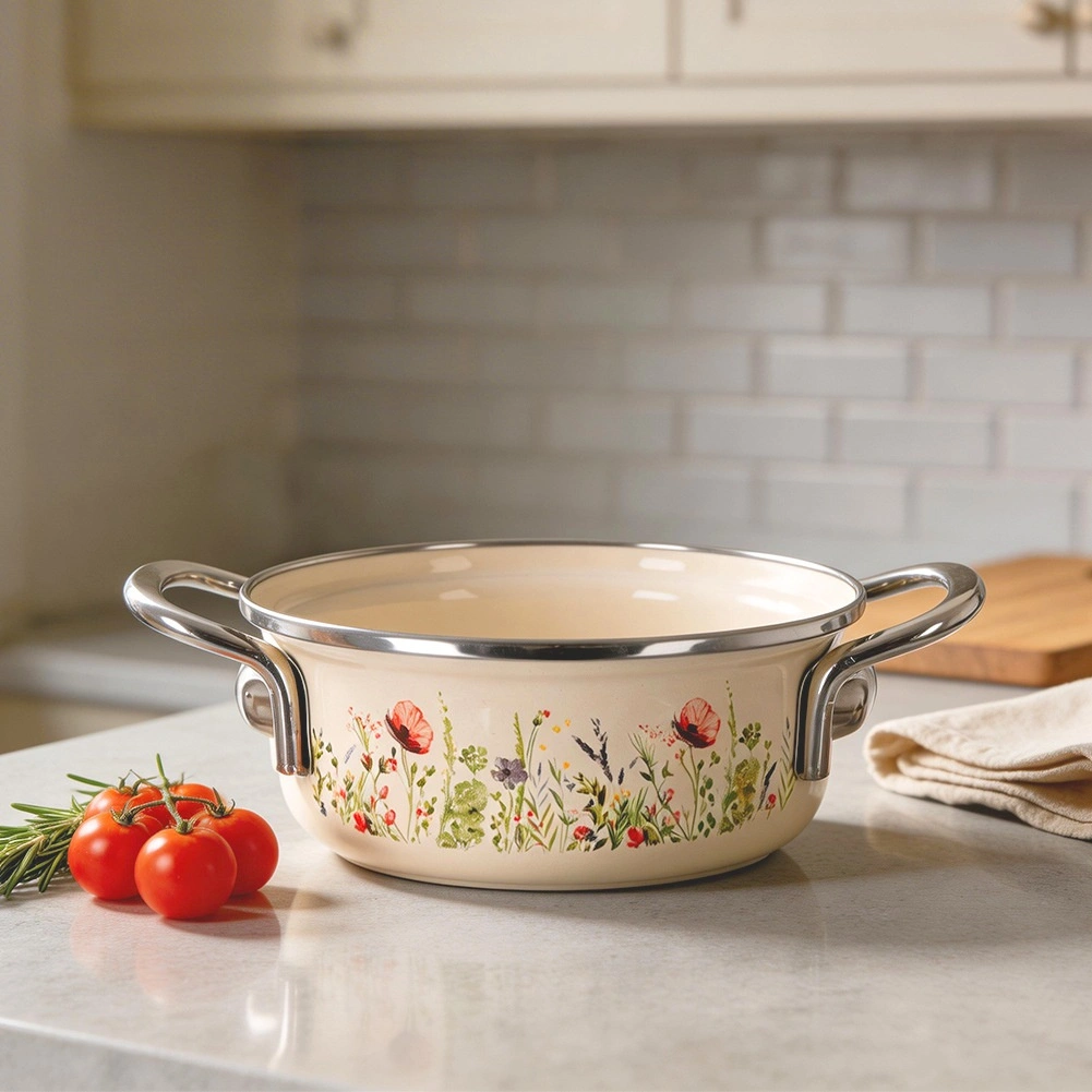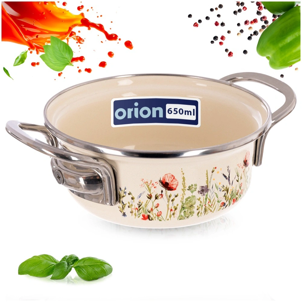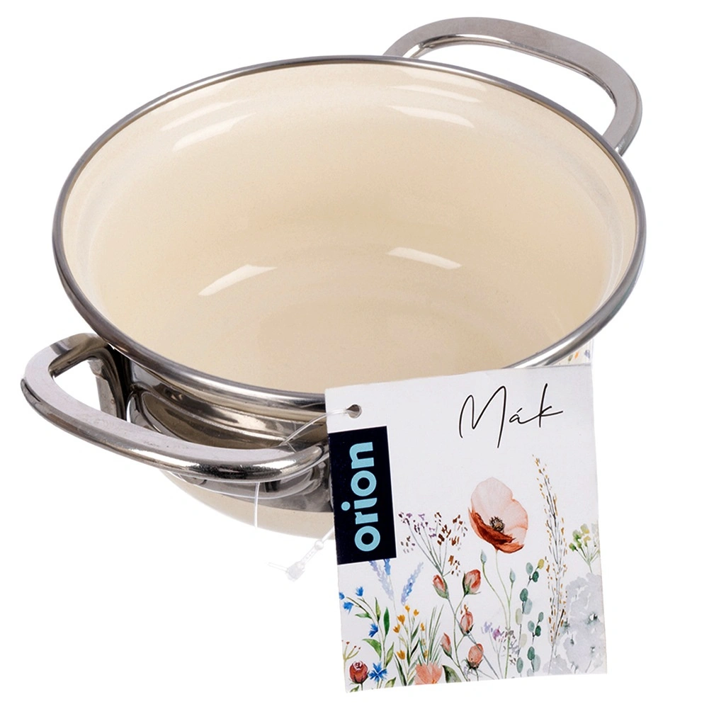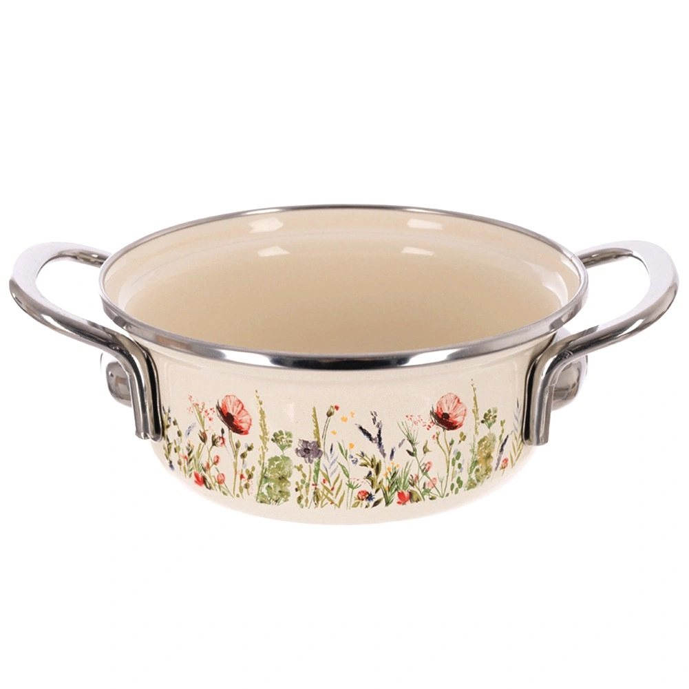 Der stilvolle Topf im Retro-Design überzeugt durch die cremefarbene Ausführung mit floraler Dekoration und die robuste Konstruktion. Dank der kompakten Größe (Durchmesser 14 cm, Höhe 6 cm, Volumen 600 ml, Länge mit Griffen 20 cm) ist er perfekt für Saucen, Suppen, Breie oder zum Anschmoren von Beilagen. Die emaillierte Oberfläche ist hygienisch, widerstandsfähig und auch für Allergiker geeignet.
