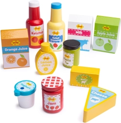 Dieses sorgfältig gestaltete Holzset enthält eine Auswahl beliebter „haltbarer“ Lebensmittel – zum Beispiel Ketchup, Dressing, Milch, Apfel-, Orangen- und Zitronensaft, Konfitüre, Butter, Pesto, Käse und Joghurt. Realistische Formen und farbige Etiketten laden zum Spielen ein und vermitteln ganz nebenbei Wissen über Lebensmittel sowie Gespräche über gesunde Ernährung.