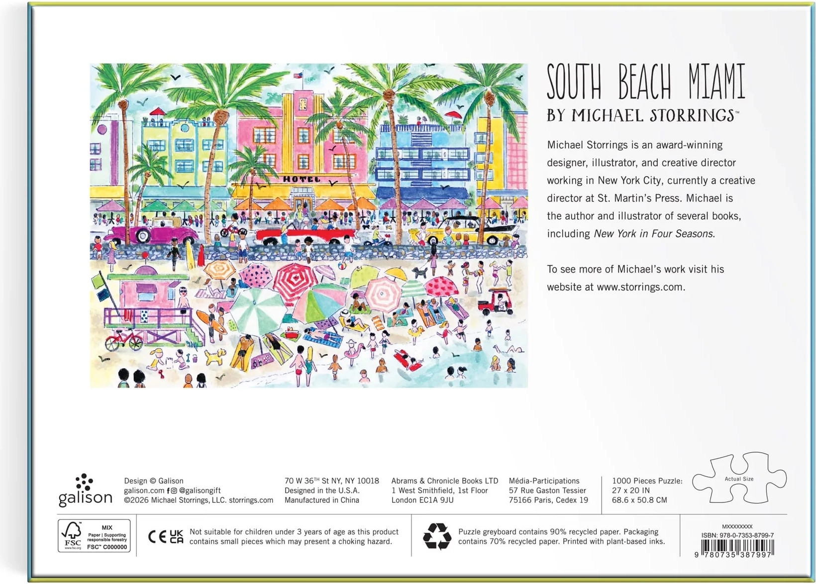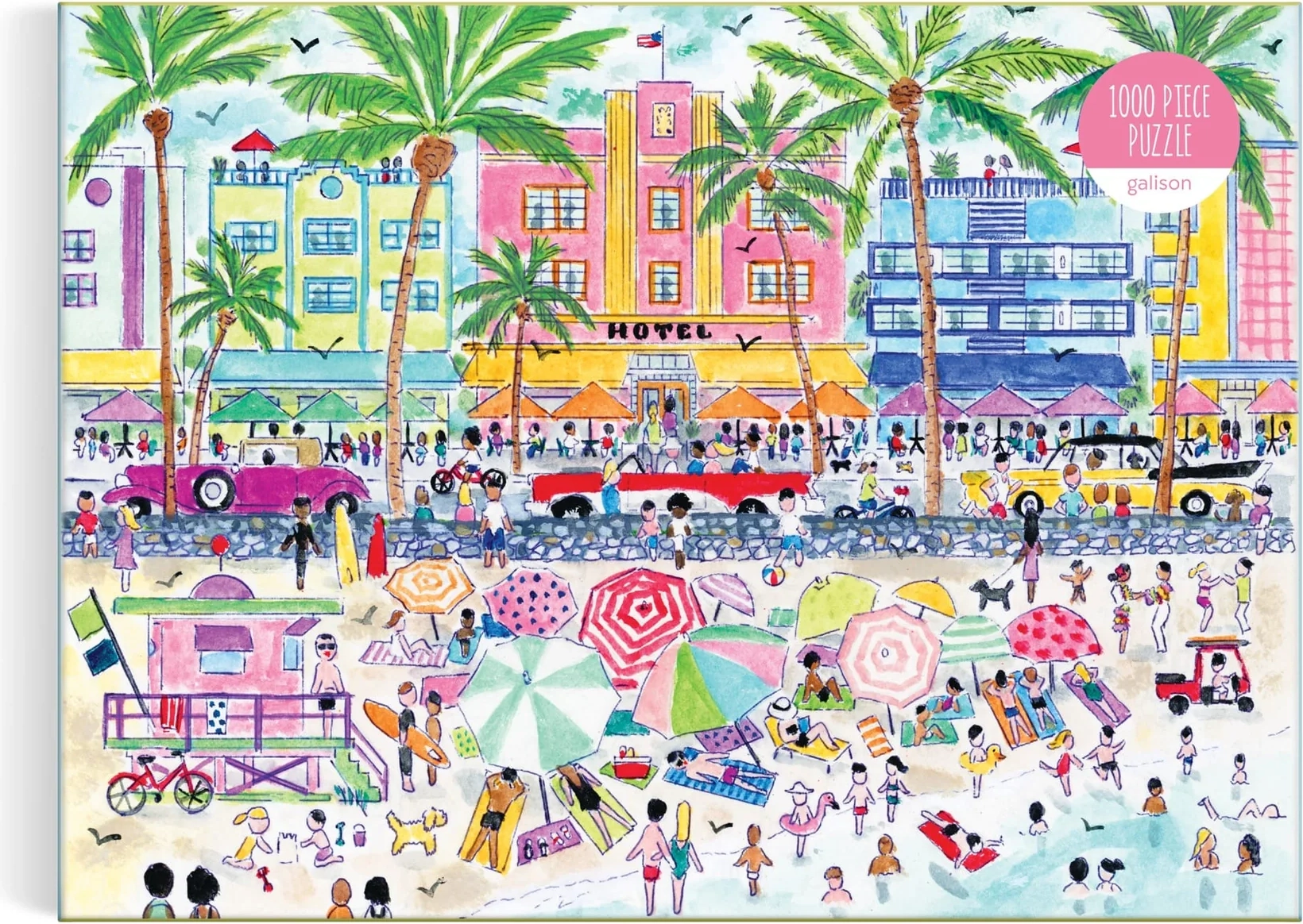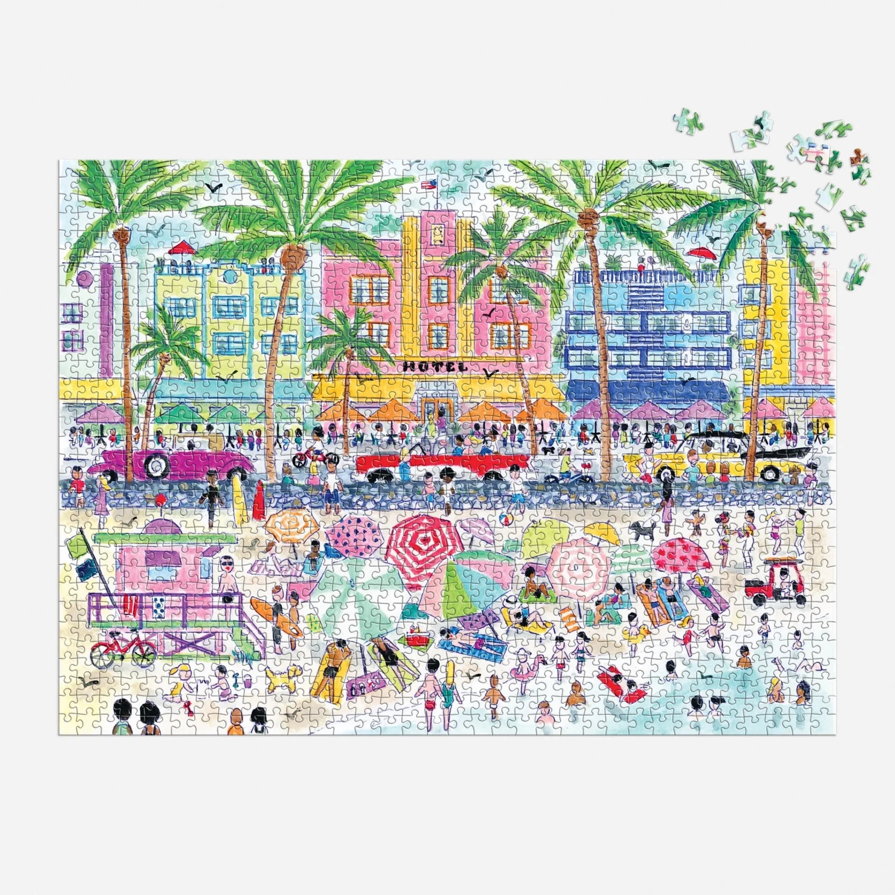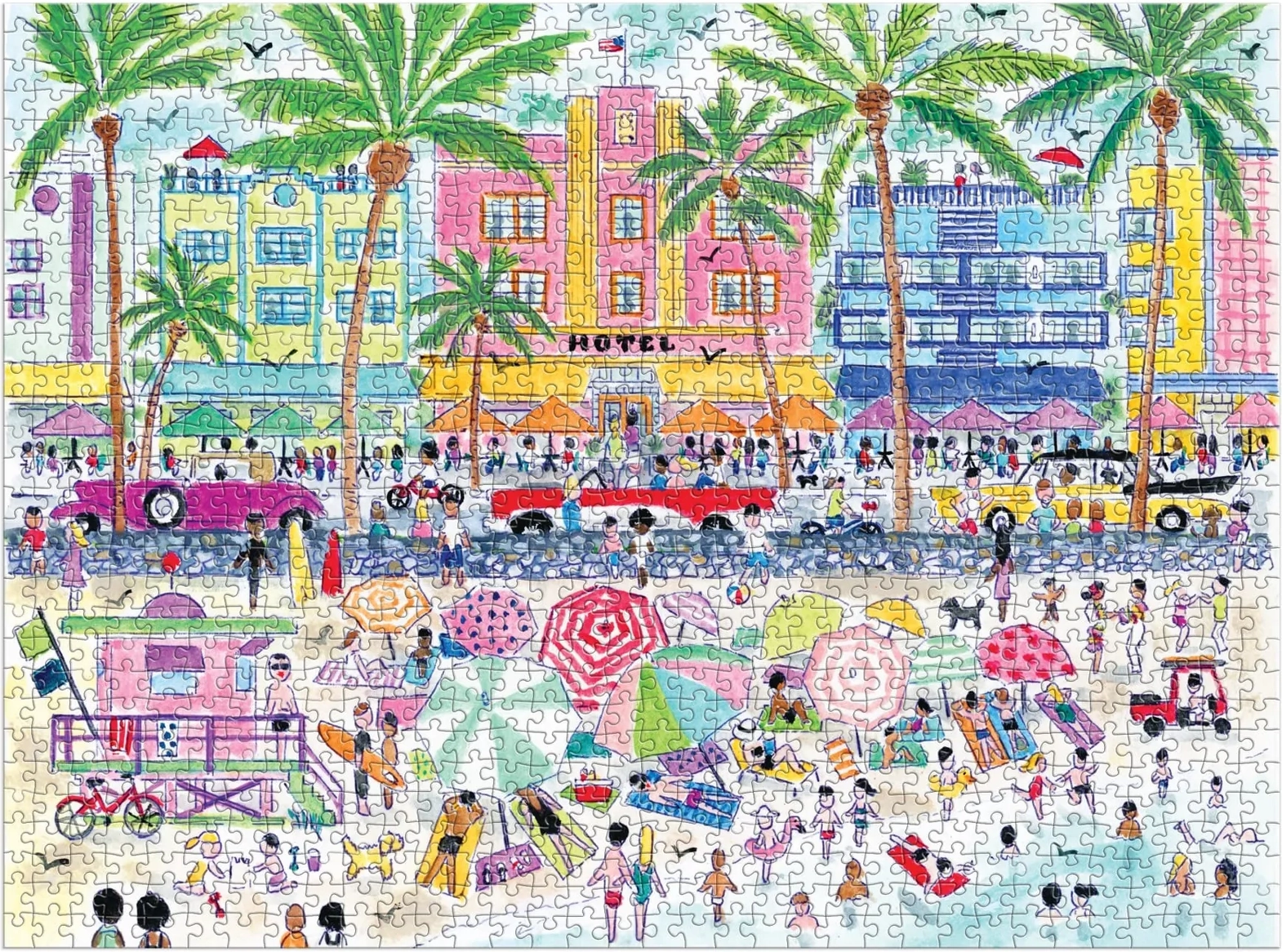 Tauchen Sie ein in die farbenfrohe Welt des ikonischen Stadtteils South Beach in Miami. Dieses Premium-Puzzle bietet 1000 präzise gestanzte Teile, die nahtlos ineinandergreifen und ein detailreich gestaltetes Motiv mit der einzigartigen Atmosphäre der Küste, Art-Déco-Architektur und Palmen enthüllen.