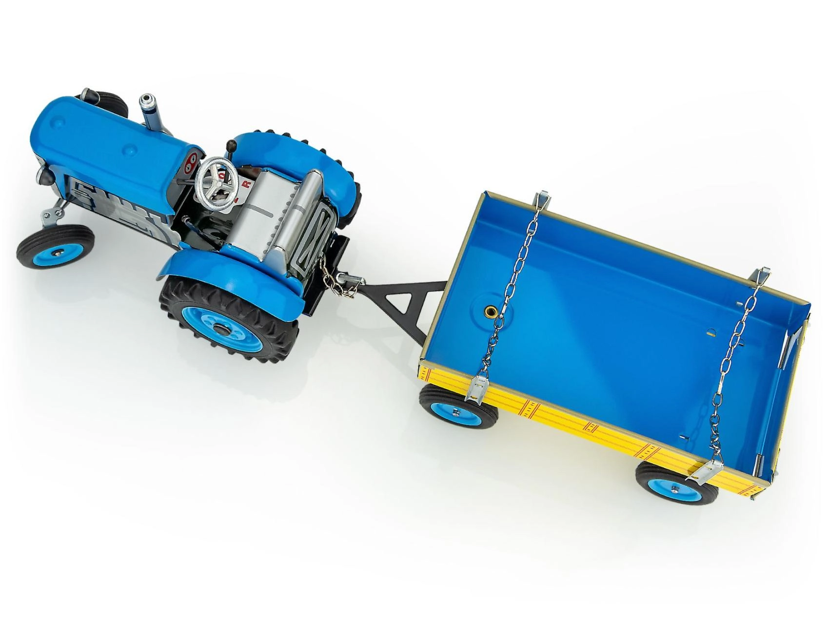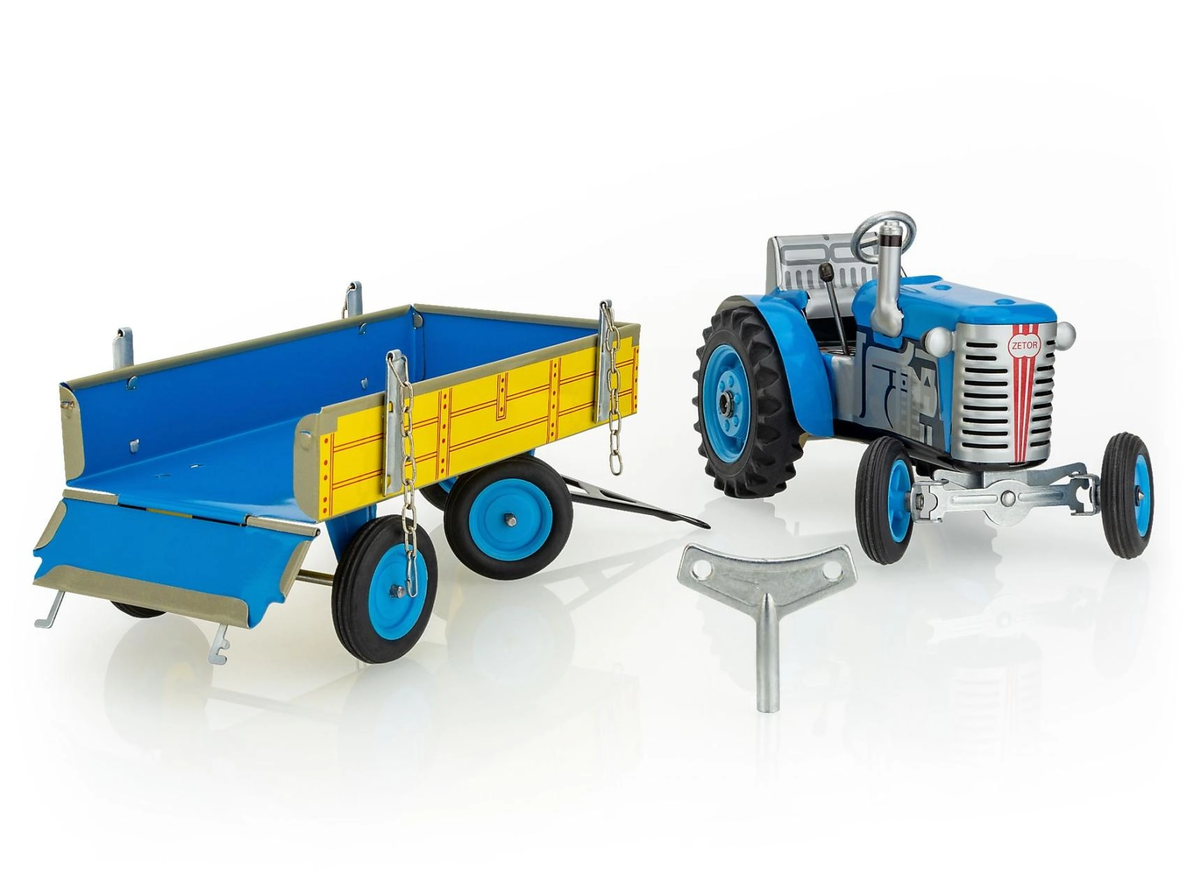 Dieser präzise verarbeitete Metalltraktor ZETOR mit Anhänger der tschechischen Marke KOVAP wird klassisch mit einem Aufziehschlüssel betrieben. Dank des echten Getriebes und der Handbremse bietet er eine realistische Steuerung und stundenlangen Spielspaß. Ideal für Kinder ab 3 Jahren sowie für Sammler traditioneller Blechspielzeuge.
