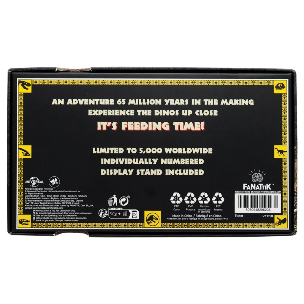Dekorative Details wie stilisierte Datum- und Ortsangaben verleihen der Karte die Glaubwürdigkeit eines Film-Tickets. Dank der kompakten Abmessungen lässt sie sich leicht in der Geldbörse, in einer Schachtel oder im Regal aufbewahren. Ein perfektes Geschenk für Liebhaber der Dinosaurier-Saga, eine großartige Ergänzung zu weiterem lizenzierten Merchandise und ein auffälliges Stück für jede Sammlung.