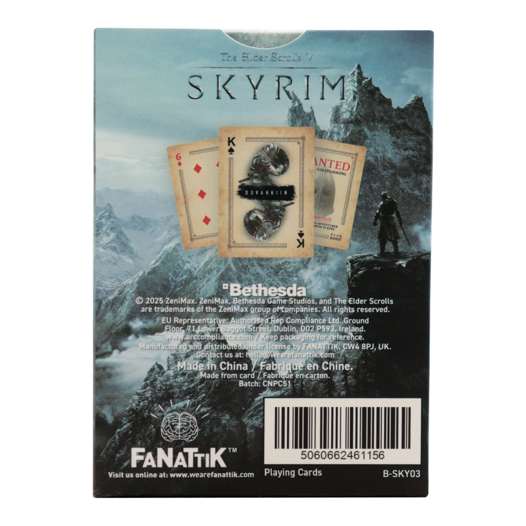 Die Karten haben Standardgröße und eine glatte Oberfläche für flüssiges Mischen und Austeilen. Traditionelle Kartensymbole sind dezent angepasst, um zur Fantasy-Ästhetik von Skyrim zu passen – ideal für Spieleabende zu Hause und für die Sammlung.