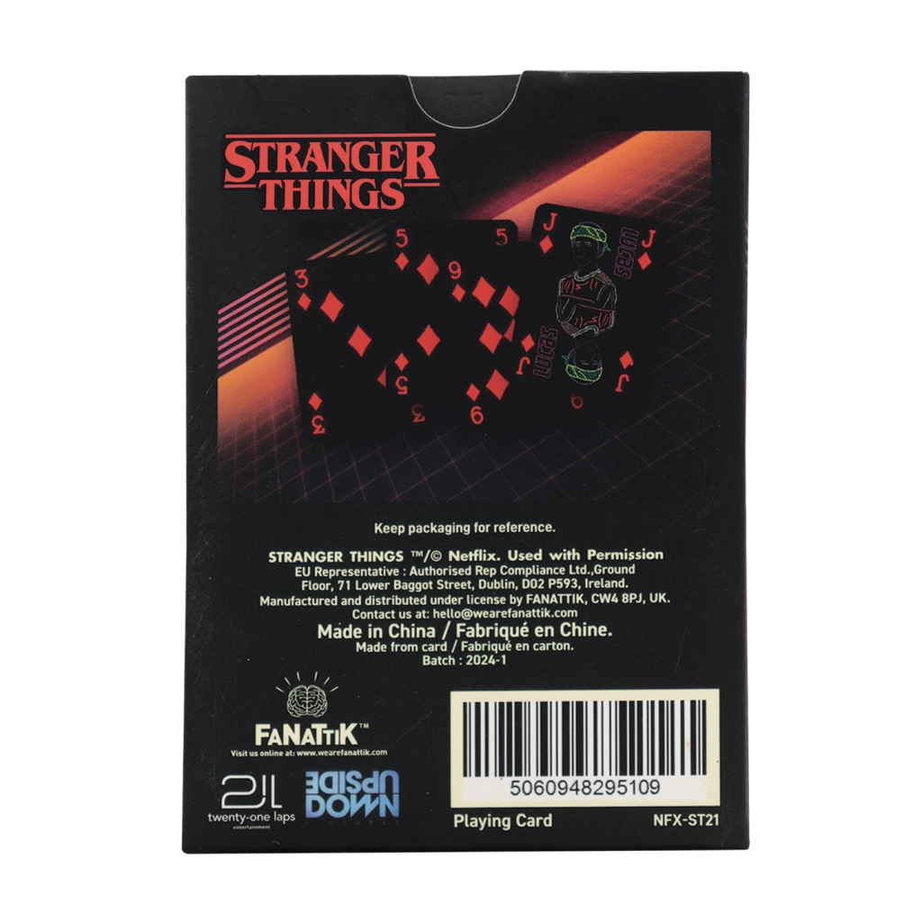 Betreten Sie die Welt von STRANGER THINGS mit einem thematischen Kartenset, das Sammelwert und täglichen Spielspaß vereint. Die Karten überzeugen durch eine dunkelere Farbpalette und markante Motive, die der Serie treu bleiben, und behalten gleichzeitig hervorragende Lesbarkeit und eine angenehme Handhabung während des Spiels.