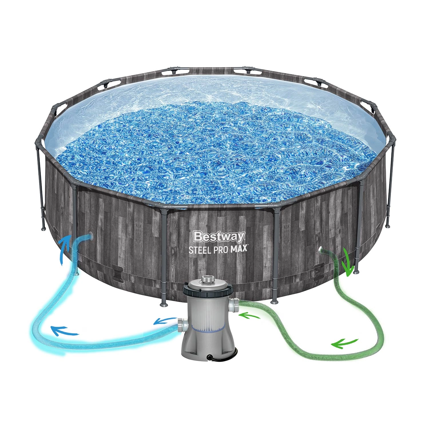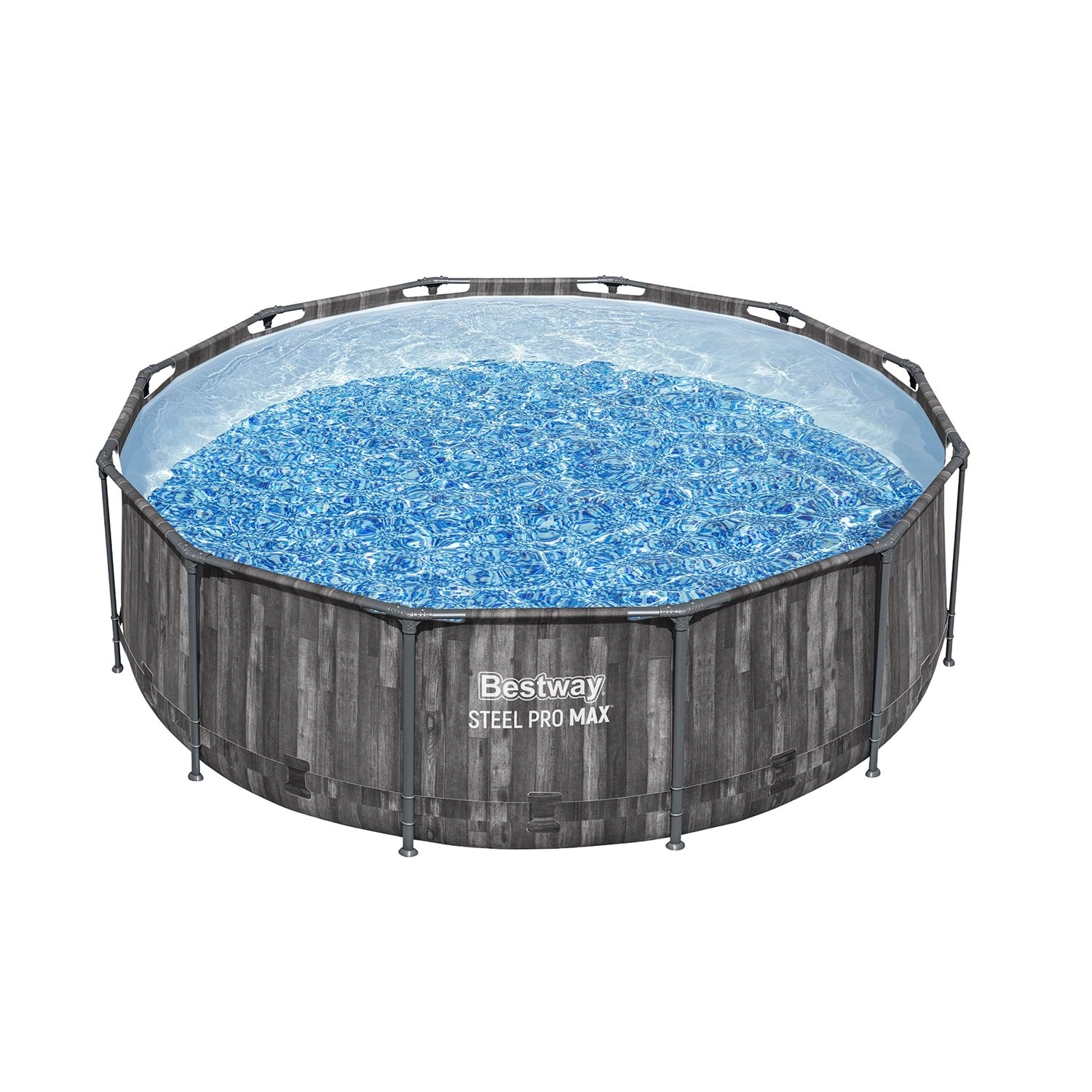 Die stabile Steel Pro MAX Konstruktion mit Korrosionsschutz und 3‑schichtiger PVC-Folie, verstärkt mit Nylongewebe, gewährleistet eine lange Lebensdauer und sicheres Baden.