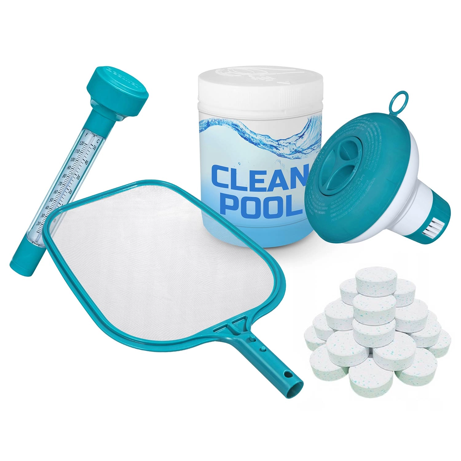 Die Filterpumpe mit Filter Typ II, ein Dosierer mit Multitabletten, Kescher und Thermometer halten das Wasser mit minimalem Aufwand kristallklar.
