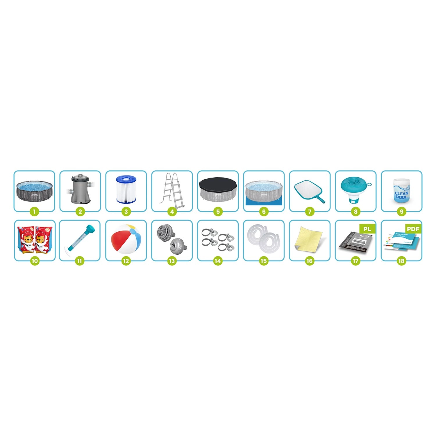 Zum 18-in-1-Set gehört die komplette Ausstattung für einfache Installation und sorgenfreie Pflege: eine leistungsstarke Filterpumpe mit Filter Typ II, Abdeckung gegen Verunreinigungen, Unterlage zum Schutz des Bodens, eine Sicherheitsleiter mit abnehmbaren Stufen, Multitabletten mit Dosierer, Thermometer, Kescher, Schläuche und Klemmen, Sieb für die Pumpe sowie ein Reparaturflicken. Auch ein farbiger Strandball für Familienspaß ist dabei.