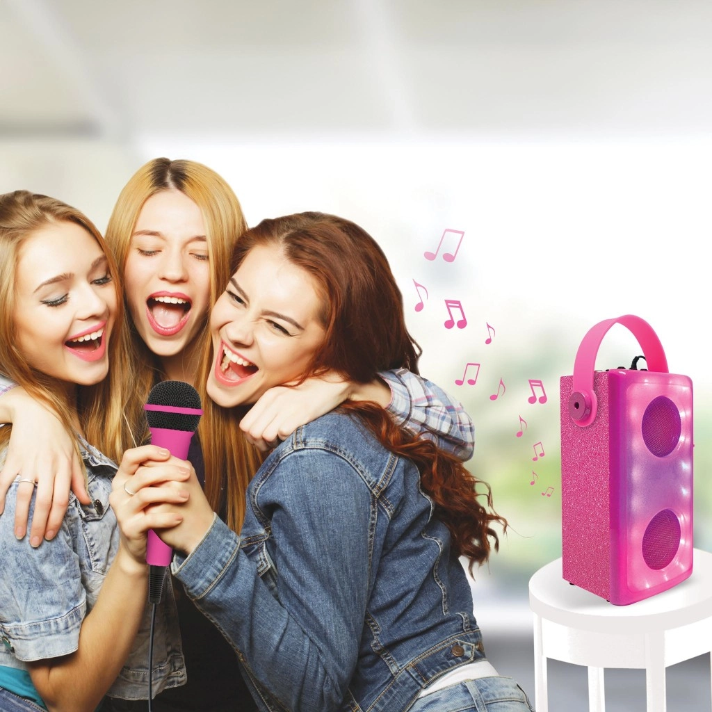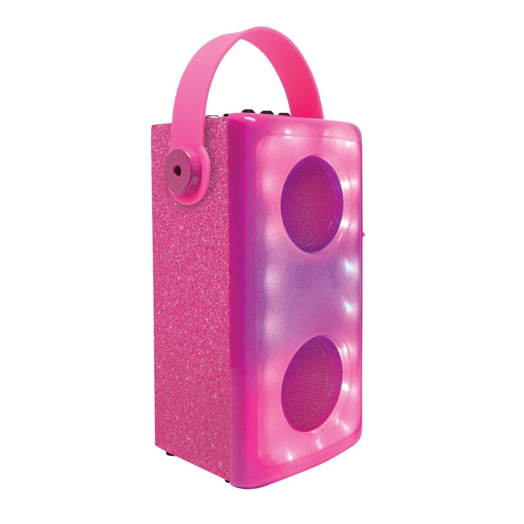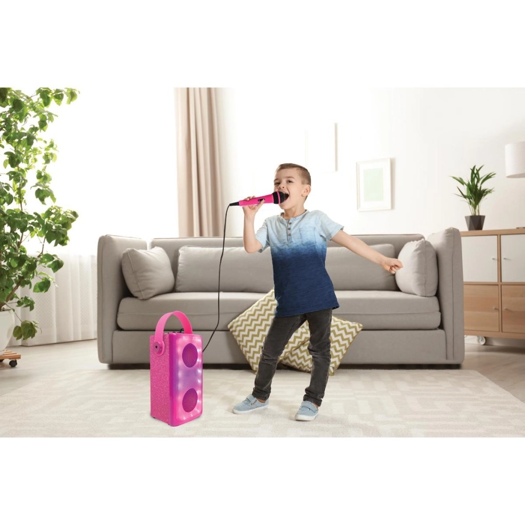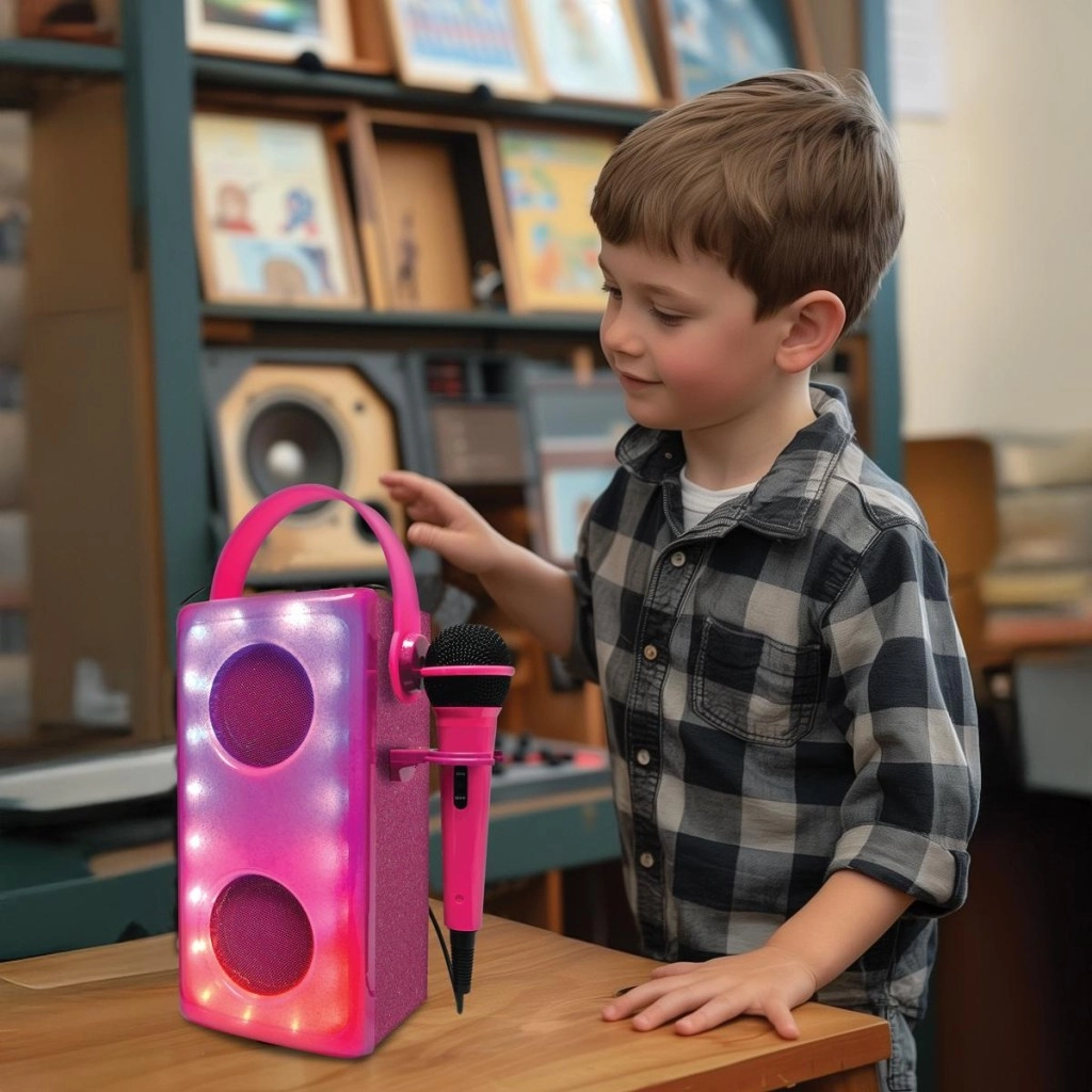 Der stylische Lautsprecher im glitzernden Rosa verwandelt jedes Zimmer in eine Mini-Bühne. Zwei runde Treiber, eingefasst von dynamischen LED-Lichtern, schaffen eine tolle Atmosphäre, während das mitgelieferte Mikrofon mit einfachem Schalter die Kreativität und das Selbstbewusstsein kleiner Sängerinnen und Sänger fördert.