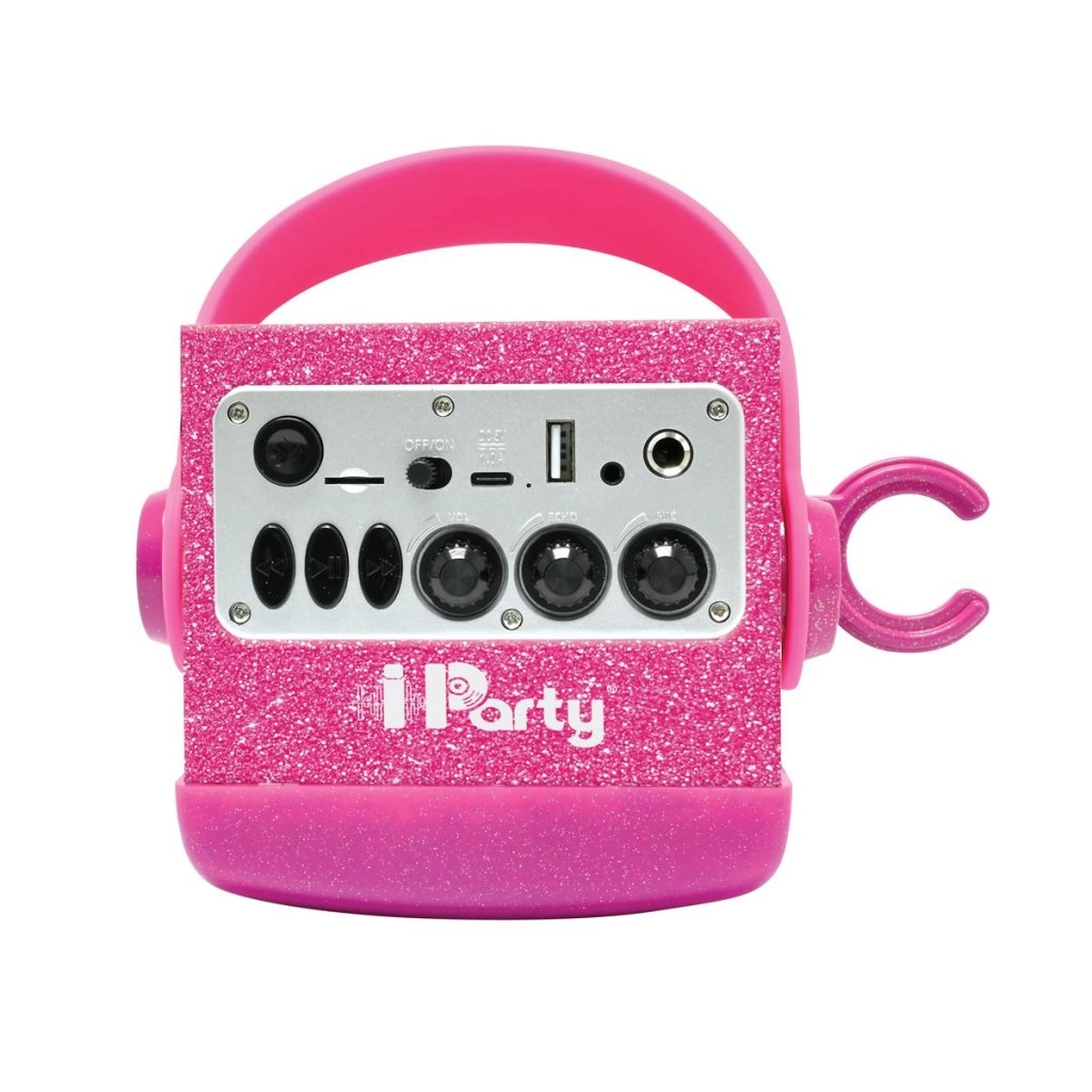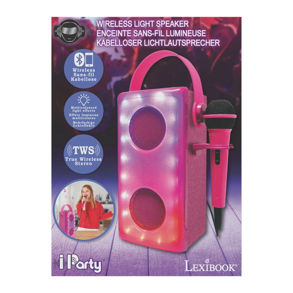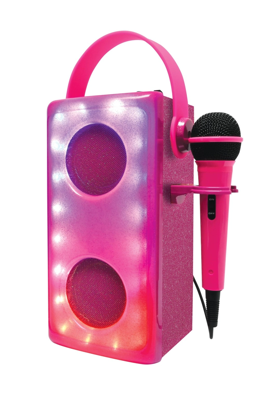 Der stylische Lautsprecher im glitzernden Rosa verwandelt jedes Zimmer in eine Mini-Bühne. Zwei runde Treiber, eingefasst von dynamischen LED-Lichtern, schaffen eine tolle Atmosphäre, während das mitgelieferte Mikrofon mit einfachem Schalter die Kreativität und das Selbstbewusstsein kleiner Sängerinnen und Sänger fördert.