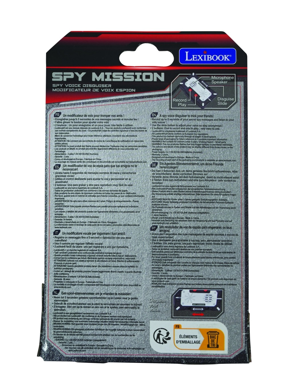 Das Gerät ist für Kinder ab 6 Jahren konzipiert, besitzt ein robustes Kunststoffgehäuse im schwarz-silbernen Design mit zwei roten Bedientasten und bietet dank der mitgelieferten LR54-Batterien sofortige Einsatzbereitschaft. Perfekt kombinierbar mit Actionfiguren, Spionagesets und Kostümen – fördert Kreativität, Fantasie und interaktives Spielen.