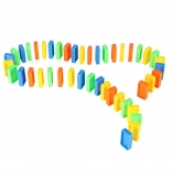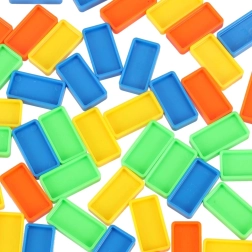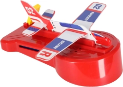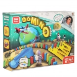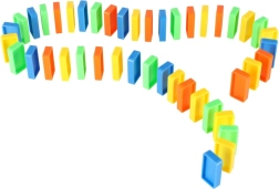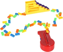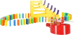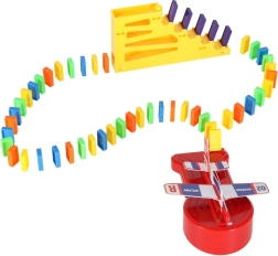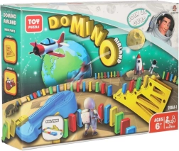 Lieferumfang: 126× Dominosteine (4 Farben), 2× Flugzeug mit Launcher, Streckenteile, 2× Kugel, 1× Figur, 12× Domino-Ständer, 52× Lernaufkleber (Buchstaben, Zahlen, mathematische Zeichen).