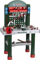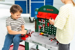 Diese vollständig ausgestattete Kinderwerkbank mit offizieller BOSCH-Lizenz verwandelt das Kinderzimmer in eine kleine Werkstatt. Für Ordnung sorgen eine gelochte Rückwand mit Haken, ein Ablageboden unter der Platte und 3 praktische Boxen für Kleinteile. Ebenfalls dabei ist ein funktionaler Kinderschraubstock für den festen Halt der Teile sowie eine stabile Arbeitsfläche.